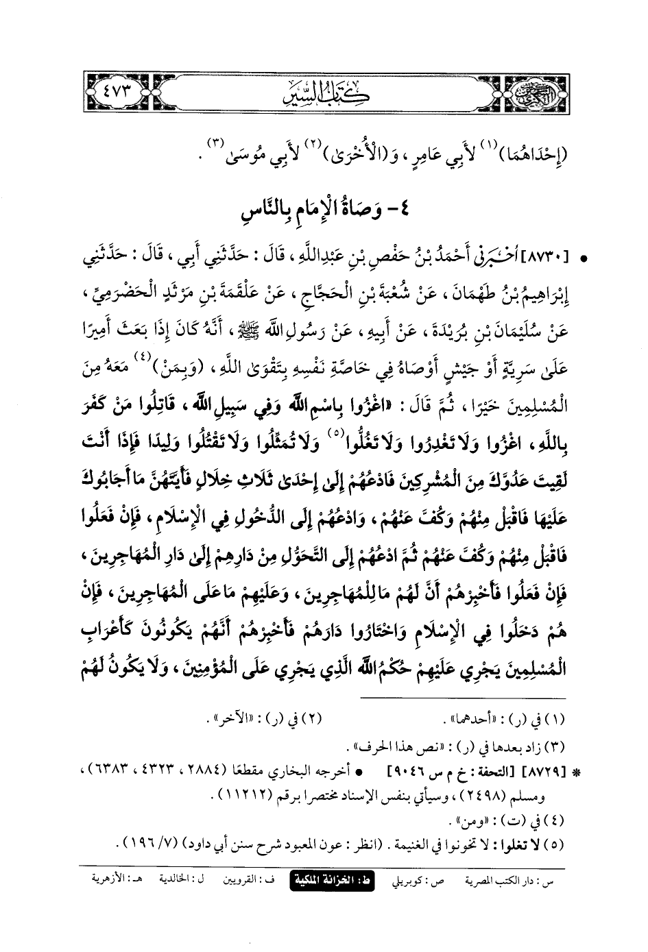 8730 - أَخْبَرَنِي أَحْمَدُ بنُ حَفْصِ بنِ عَبدِ اللهِ، قَالَ: حَدَّثني أَبي، قَالَ: حَدَّثني إِبْرَاهِيمُ بنُ طَهْمَانَ، عَن شُعبَةَ بنِ الحَجَّاجِ، عَن عَلْقَمَةَ بنِ مَرْثَدٍ الحَضْرَمِيِّ، عَن سُلَيمَانَ بنِ بُرَيْدَةَ، عَن أَبيهِ، عَن رَسُولِ اللهِ صَلى الله عَلَيهِ وسَلم، أَنَّهَ كَانَ إِذَا بَعَثَ أَمِيرًا عَلَى سَرِيَّةٍ أَوْ جَيْشٍ أَوْصَاهُ فِي خَاصَّةِ نَفْسِهِ بِتَقْوَى اللهِ، وَبِمَنْ مَعَهُ مِنَ المُسْلِمِينَ خَيْرًا، ثُمَّ قَالَ: اغْزُوا بِاسْمِ اللهِ، وَفِي سَبِيلِ اللهِ، قَاتِلُوا مَنْ كَفَرَ بِاللهِ، اغْزُوا، وَلا تَغْدِرُوا، وَلا تَغْلُوا، وَلا تُمَثِّلُوا، وَلا تَقْتُلُوا وَلِيدًا، فَإِذَا أَنْتَ لَقِيتَ عَدُوَّكَ مِنَ المُشْرِكِينَ، فَادْعُهُمْ إِلَى إِحْدَى ثَلاثِ خِلالٍ، فَأَيَّتُهُنَّ مَا أَجَابُوكَ عَلَيْهَا فَاقْبَلْ مِنْهُمْ وَكُفَّ عَنهُمْ: ادْعُهُمْ إِلَى الدُّخُولِ فِي الإِسلامِ، فَإِنْ فَعَلُوا فَاقْبَلْ مِنْهُمْ، وَكُفَّ عَنهُمْ، ثُمَّ ادْعُهُمْ إِلَى التَّحَوُّلِ مِنْ دَارِهِمْ إِلَى دَارِ المُهَاجِرِينَ، فَإِنْ فَعَلُوا، فَأَخْبِرْهُمْ أَنَّ لَهُمْ مَا لِلْمُهَاجِرِينَ وَعَلَيْهِمْ مَا عَلَى المُهَاجِرِينَ، فَإِنْ هُمْ دَخَلُوا فِي الإِسلامِ وَاخْتَارُوا دَارَهُمْ، فَأَخْبِرْهُمْ أَنَّهُمْ يَكُونُونَ كَأَعْرَابِ المُسْلِمِينَ يَجْرِي عَلَيْهِمْ حُكْمُ اللهِ الَّذِي يَجْرِي عَلَى المُؤْمِنِينَ، وَلا يَكُونُ لَهُمْ فِي الفَيْءِ وَالغَنِيمَةِ شَيْءٌ إِلاَّ أَنْ يُجَاهِدُوا مَعَ المُسْلِمِينَ، فَإِنْ أَبَوْا فَادْعُهُمْ إِلَى إِعْطَاءِ الجِزْيَةِ، فَإِنْ فَعَلُوا فَاقْبَلْ مِنْهُمْ، وَكُفَّ عَنهُمْ، فَإِنْ أَبَوْا فَاسْتَعِنْ بِاللهِ عَلَيْهِمْ، ثُمَّ قَاتِلْهُمْ، وَإِنْ أَنْتَ حَاصَرْتَ أَهْلَ حِصْنٍ فَأَرَادُوا أَنْ تُنْزِلَهُمْ عَلَى حُكْمِ اللهِ، فَلا تُنْزِلْهُمْ عَلَى حُكْمِ اللهِ، وَلَكِنْ أَنْزِلْهُمْ عَلَى حُكْمِكَ، فَإِنَّكَ لا تَدْرِي أَتُصِيبُ فِيهِمْ حُكْمَ اللهِ؟ وَإِنْ أَنْتَ حَاصَرْتَ أَهْلَ حِصْنٍ فَأَرَادُوا أَنْ تَجْعَلَ لَهُمْ ذِمَّةَ اللهِ، وَذِمَّةَ رَسُولِهِ، فَلا تَجْعَلْ لَهُمْ ذِمَّةَ اللهِ، وَذِمَّةَ رَسُولِهِ، وَلَكِنِ اجْعَلْ لَهُمْ ذِمَّتَكَ، وَذِمَّةَ أَبيكَ، وَذِمَمَ أَصْحَابِكَ، فَإِنَّكُمْ أَنْ تُخْفِرُوا ذِمَمَكُمْ، وَذِمَمَ آبَائِكُمْ وَذِمَمَ أَصْحَابِكُمْ، أَهْوَنُ عَلَيْكُمْ مِنْ أَنْ تُخْفِرُوا ذِمَّةَ اللهِ، وَذِمَّةَ رَسُولِهِ.
