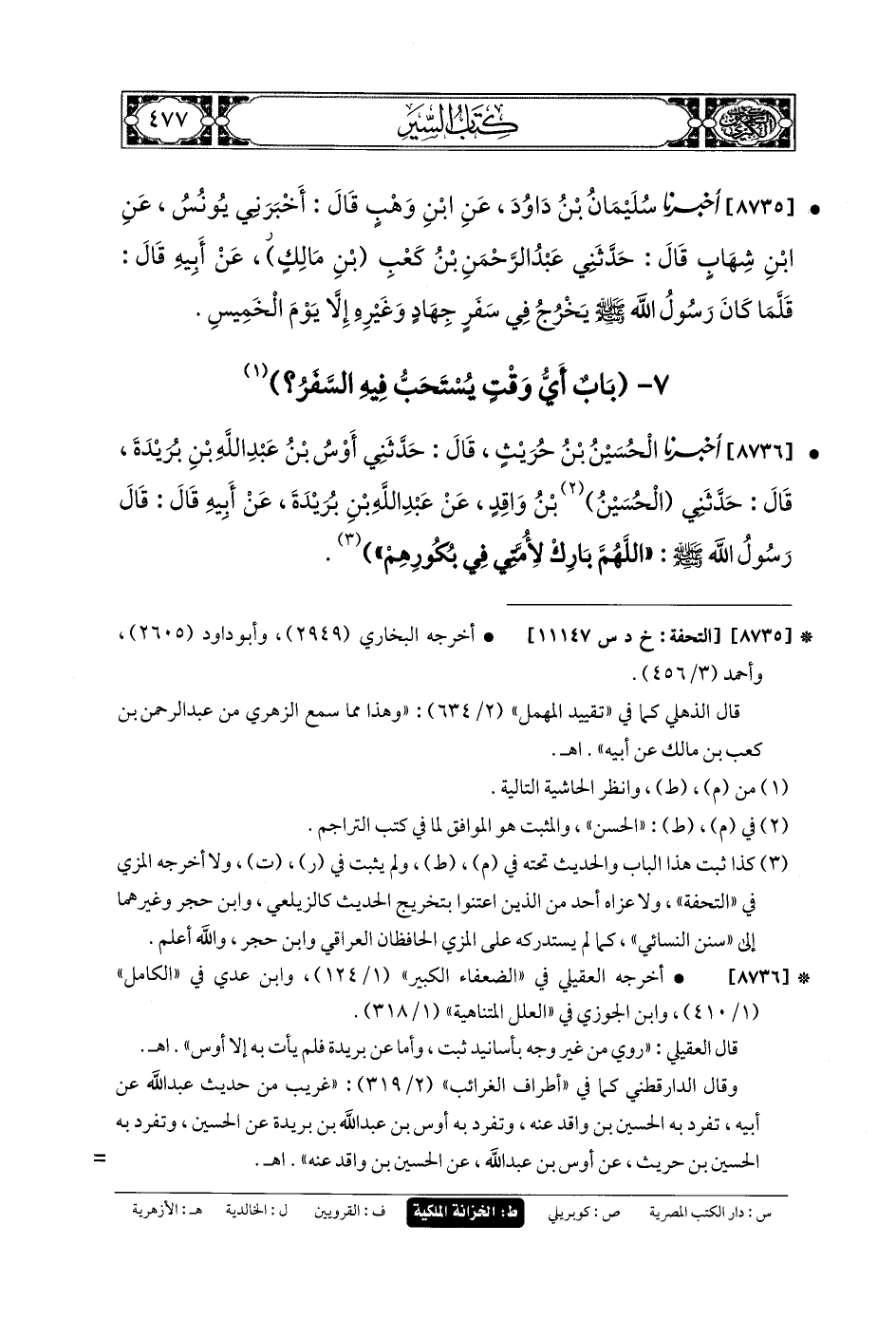 8735- أَخبَرنا سُلَيمَانُ بنُ دَاوُدَ، عَنِ ابنِ وَهْبٍ، قَالَ: أَخْبَرَنِي يُونُسُ، عَنِ ابنِ شِهَابٍ، قَالَ: حَدَّثني عَبدُ الرَّحمَنِ بنُ كَعْبٍ، عَن أَبيهِ، قَالَ: قَلَّمَا كَانَ رَسُولُ اللهِ صَلى الله عَلَيهِ وسَلم يَخْرُجُ فِي سَفَرٍ جِهَادٍ وَغَيْرِهِ إِلاَّ يَوْمَ الخَمِيسِ.