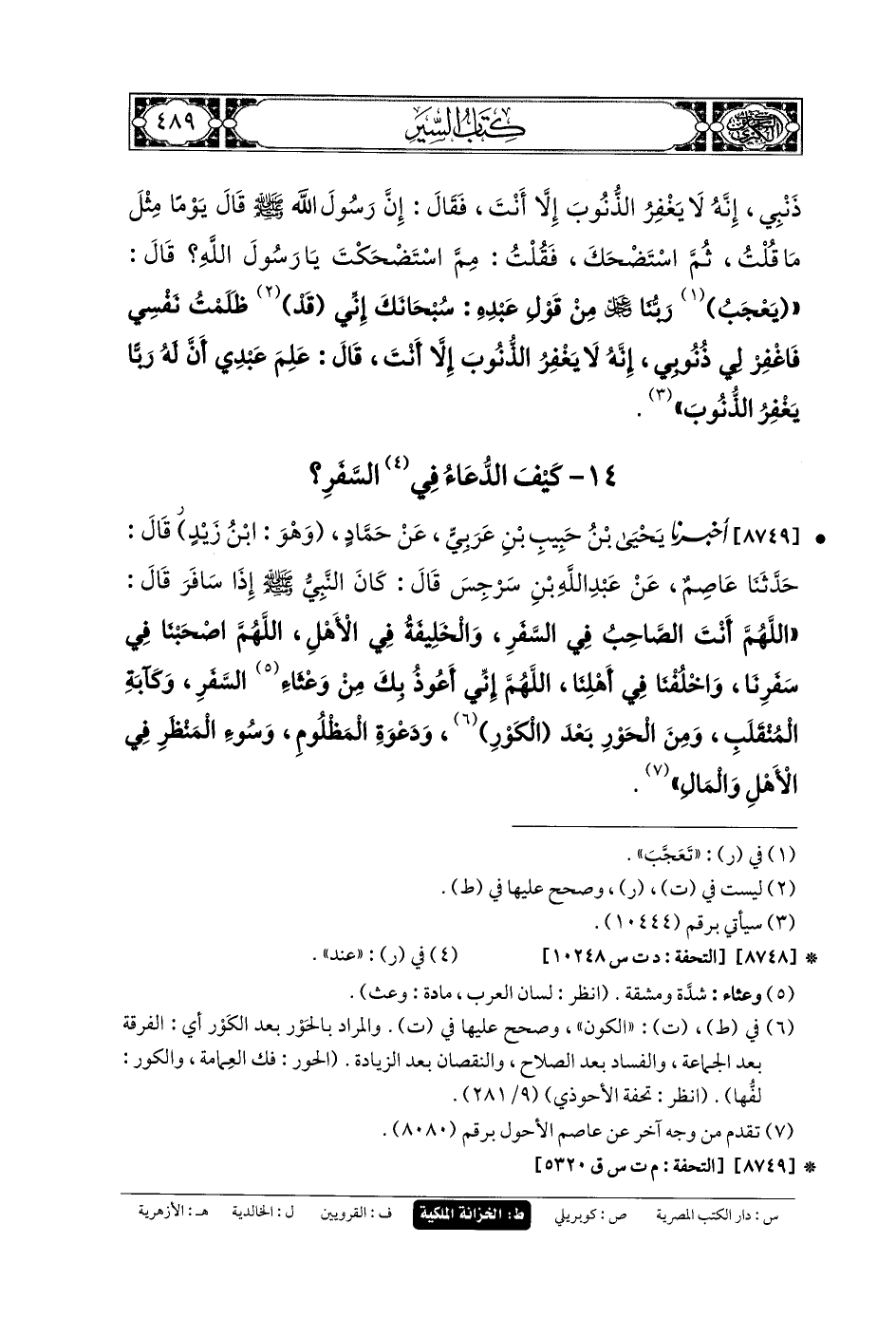 8749- أَخبَرنا يَحيَى بنُ حَبِيبِ بنِ عَرَبِيٍّ، عَن حَمَّادٍ وهو ابن زيد، قَالَ: حَدثنا عَاصِمٌ، عَن عَبدِ اللهِ بنِ سَرْجِسَ قَالَ: كَانَ النَّبيُّ صَلى الله عَلَيهِ وسَلم إِذَا سَافَرَ قَالَ: اللهُمَّ أَنْتَ الصَّاحِبُ فِي السَّفَرِ، وَالخَلِيفَةُ فِي الأَهْلِ، اللهُمَّ اصْحَبْنَا فِي سَفَرِنَا، وَاخْلُفْنَا فِي أَهْلِنَا، اللهُمَّ إِنِّي أَعُوذُ بِكَ مِنْ وَعْثَاءِ السَّفَرِ، وَكَآبَةِ المُنْقَلَبِ، وَمَنِ الحَوْرِ بَعْدَ الكَوْنِ، وَدَعْوَةِ المَظْلُومِ، وَسُوءِ المَنْظَرِ فِي الأَهْلِ وَالمَالِ.
