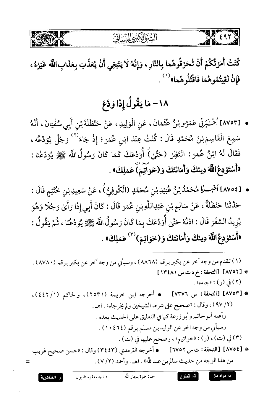 8753- أَخْبَرَنِي عَمْرُو بنُ عُثْمَانَ، عَنِ الوَلِيدِ، عَن حَنْظَلَةَ بنِ أَبي سُفيانَ، أَنَّهُ سَمِعَ القَاسِمَ بْنَ مُحَمدٍ قَالَ: كُنْتُ عِنْدَ ابنِ عُمَرَ إِذْ جَاءَ رَجُلٌ يُوَدِّعُهُ، فَقَالَ لَهُ ابنُ عُمَرَ: انْتَظِرْ حتى أُوَدِّعْكَ كَمَا كَانَ رَسُولُ اللهِ صَلى الله عَلَيهِ وسَلم يُوَدِّعُنَا: اسْتَوْدِعِ اللهَ دَيْنَكَ، وَأَمَانَتَكَ، وَخَوَاتِمَ عَمَلِكَ.