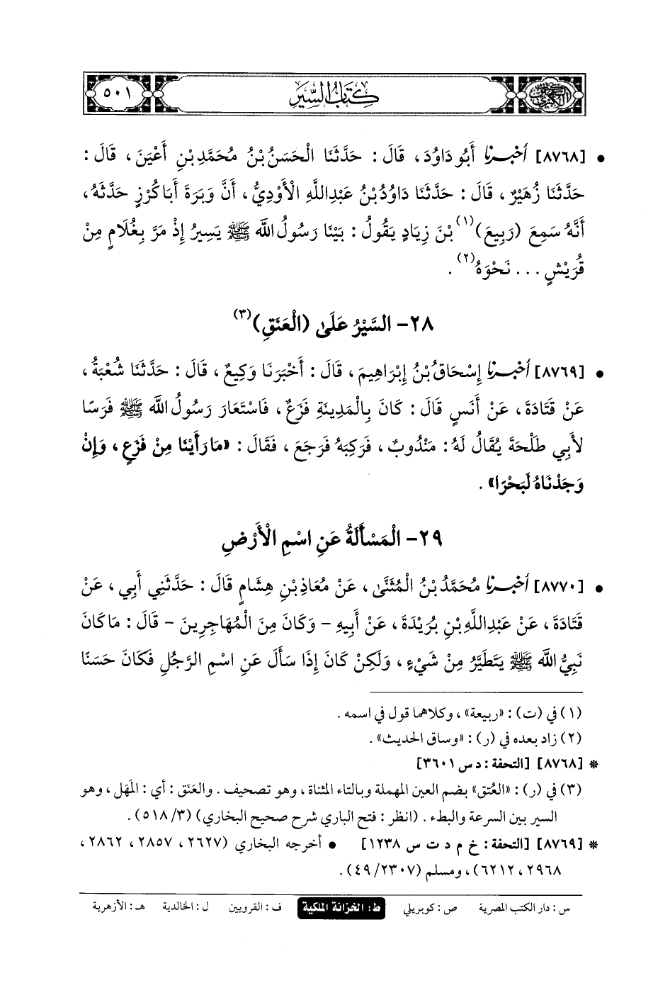8769- أَخبَرنا إِسحَاقُ بنُ إِبْرَاهِيمَ، قَالَ: أَخبَرنا وَكِيعٌ، قَالَ: حَدثنا شُعبَةُ، عَن قَتَادَةَ، عَن أَنَسٍ قَالَ: كَانَ بِالمَدِينَةِ فَزَعٌ، فَاسْتَعَارَ رَسُولُ اللهِ صَلى الله عَلَيهِ وسَلم فَرَسًا لأَبي طَلحَةَ يُقَالُ لَهُ: مَنْدُوبٌ، فَرَكِبَهُ فَرَجَعَ فَقَالَ: مَا رَأَيْنَا مِنْ فَزَعٍ، وَإِنْ وَجَدْنَاهُ لَبَحْرًا.