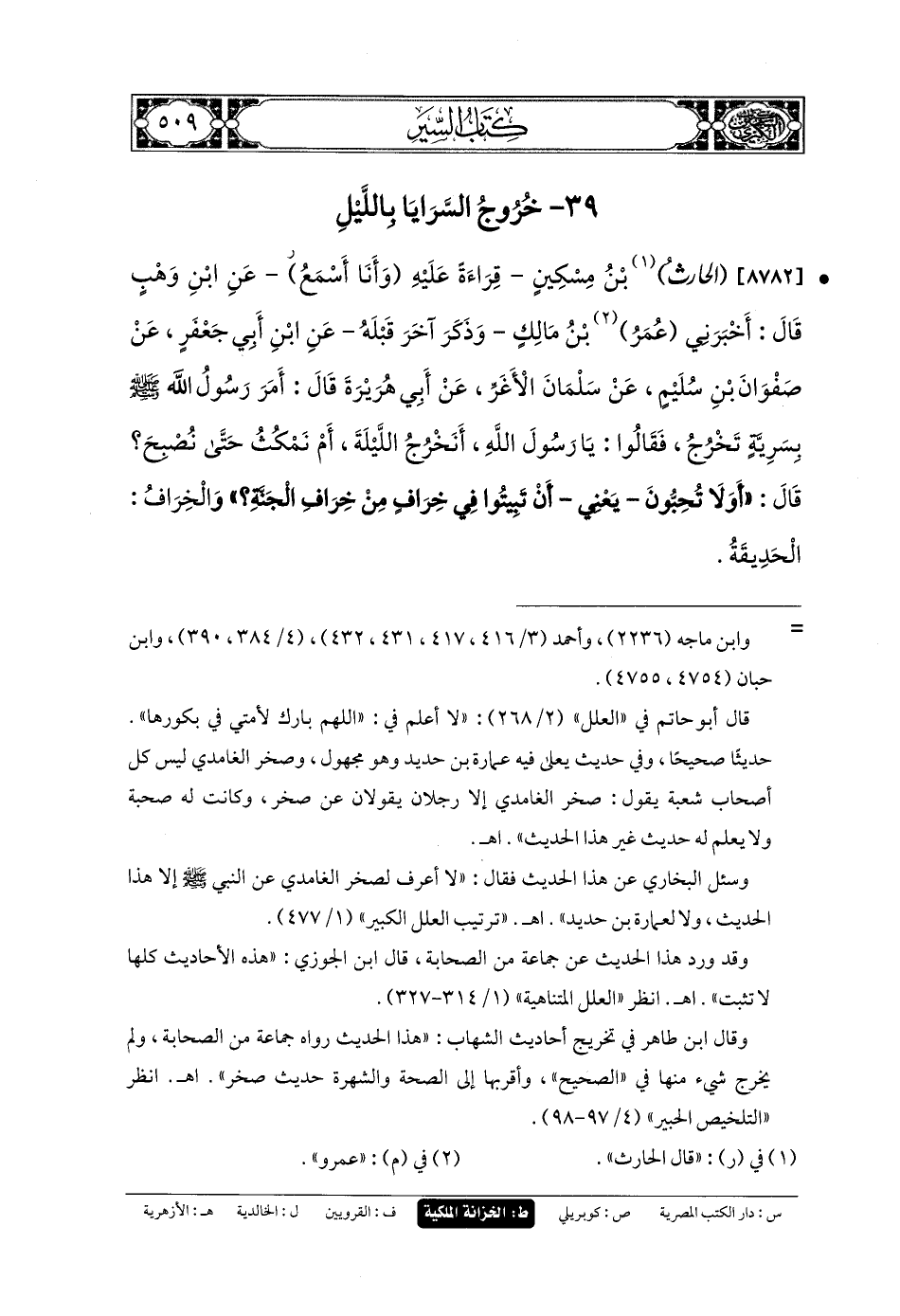 8782- الحَارِثُ بنُ مِسْكِينٍ، قِرَاءَةً عَلَيْهِ، وَأَنَا أَسْمَعُ، عَنِ ابنِ وَهْبٍ، قَالَ: أَخْبَرَنِي عُمَرُ بنُ مَالِكٍ، وَذَكَرَ آخَرَ قَبْلَهُ، عَنِ ابنِ أَبي جَعفَرٍ، عَن صَفْوَانَ بنِ سُلَيْمٍ، عَن سَلْمَانَ الأَغَرِّ، عَن أَبي هُرَيْرَةَ قَالَ: أَمَرَ رَسُولُ اللهِ صَلى الله عَلَيهِ وسَلم بِسَرِيَّةٍ تَخْرُجُ، فَقَالُوا: يَا رَسُولَ اللهِ، أَنخرُجُ اللَّيْلَةَ أَمْ نَمْكُثُ حَتَّى نُصْبِحَ؟ قَالَ: أَوَلا تُحِبُّونَ، يَعْنِي أَنْ تَبِيتُوا فِي خِرَافٍ مِنْ خِرَافِ الجَنَّةِ؟ والخِرَافُ: الحَدِيقَةُ.