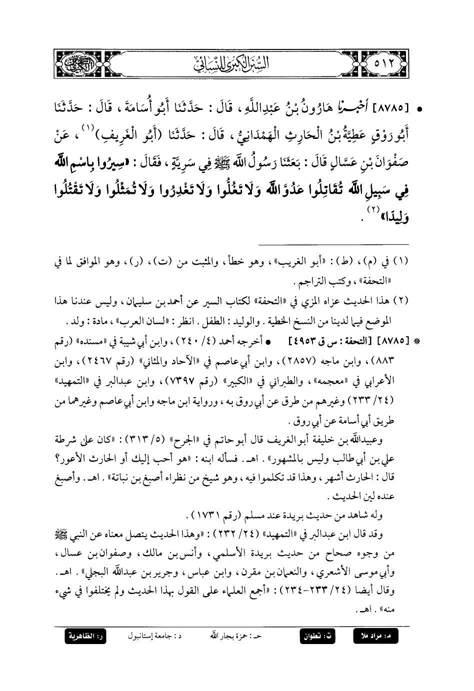 8785- أَخْبَرَنا هَارُونُ بنُ عَبدِ اللهِ، قَالَ: حَدثنا أَبو أُسَامَةَ، قَالَ: حَدثنا أَبو رَوْقٍ عَطِيَّةُ بنُ الحَارِثِ الهَمَدَانِيُّ، قَالَ: حَدثنا أَبو الغَرِيفِ، عَن صَفْوَانَ بنِ عَسَّالٍ قَالَ: بَعَثَنَا رَسُولُ اللهِ صَلى الله عَلَيهِ وسَلم فِي سَرِيَّةٍ فَقَالَ: سِيرُوا بِاسْمِ اللهِ، فِي سَبِيلِ اللهِ، تُقَاتِلُوا عَدُوَّ اللهِ، وَلا تَغُلُّوا، وَلا تَغْدِرُوا، وَلا تُمَثِّلُوا، وَلا تَقْتُلُوا وَلِيدًا.
