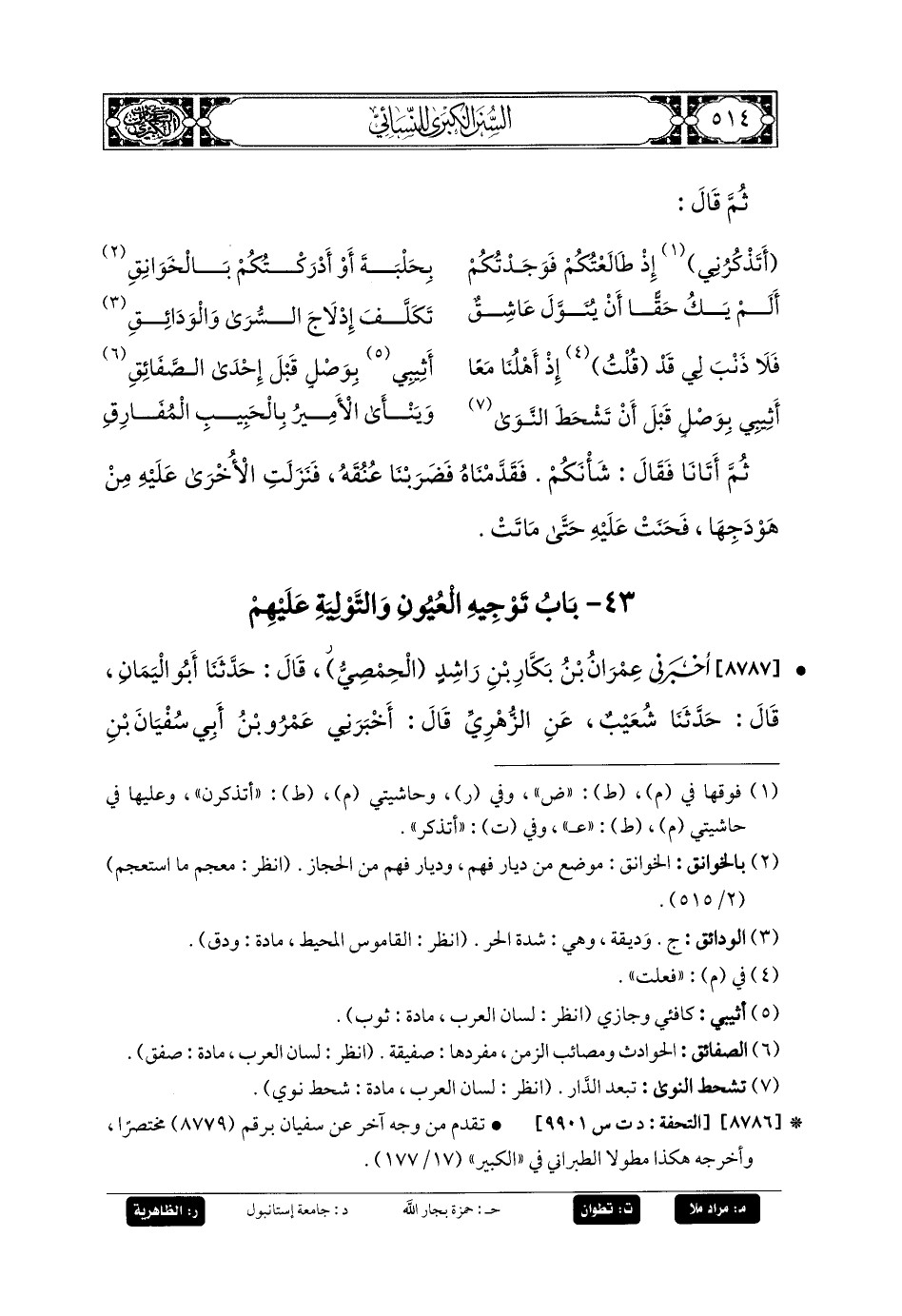 8787- أَخْبَرَنِي عِمْرَانُ بنُ بَكَّارِ بنِ رَاشِدٍ الحمصي، قَالَ: حَدثنا أَبو اليَمَانِ، قَالَ: حَدثنا شُعَيْبٌ، عَنِ الزُّهْرِيِّ، قَالَ: أَخْبَرَنِي عَمْرُو بنُ أَبي سُفيانَ بنِ أَسِيدِ بنِ جَارِيَةَ الثَّقَفِيُّ، وَكَانَ مِنْ أَصْحَابِ أَبي هُرَيْرَةَ، أَنَّ أَبَا هُرَيْرَةَ قَالَ: إِنَّ النَّبيَّ صَلى الله عَلَيهِ وسَلم بَعَثَ عَشَرَةَ رَهْطٍ سَرِيَّةً عَيْنًا، وَأَمَّرَ عَلَيْهِمْ عَاصِمَ بْنَ ثَابِتٍ الأَنْصَارِيَّ، جَدَّ عَاصِمِ بنِ عُمَرَ بنِ الخَطَّابِ، فَانْطَلَقُوا حَتَّى إِذَا كَانُوا بِالهَدْأَةِ، وَهِيَ بَيْنَ عُسْفَانَ وَمَكَّةَ، ذُكِرُوا لِحَيٍّ مِنْ هُذَيْلٍ يُقَالُ لَهُمْ: بَنُو لَحْيَانَ، فنَفَرُوا لَهُمْ بِقَرِيبٍ مِنْ مِئَةِ رَجُلٍ رَامٍ، فَاقْتَصُّوا آثَارَهُمْ حَتَّى وَجَدُوا مَأْكَلَهُمْ تَمْرًا تَزَوَّدُوهُ مِنَ المَدِينَةِ، فَاتَّبَعُوا آثَارَهُمْ، فَلَمَّا رَآهُمْ عَاصِمٌ وَأَصْحَابُهُ لَجَؤُوا إِلَى فَدْفَدٍ، وَأَحَاطَ بِهِمُ القَوْمُ، فَقَالُوا لَهُمُ: انْزِلُوا وَأَعْطُونَا بِأَيْدِيكُمْ، وَلَكُمُ العَهْدُ وَالمِيثَاقُ، لا نقْتَلُ مِنْكُمْ أَحَدٌ، فَقَالَ عَاصِمُ بنُ ثَابِتٍ أَمِيرُ السَّرِيَّةِ: أَمَّا أَنَا، فَوَاللَّهِ لا أَنْزِلُ اليَوْمَ فِي ذِمَّةِ كَافِرٍ، اللهُمَّ أَخْبِرْ عَنَّا نَبِيَّكَ صَلى الله عَلَيهِ وسَلم، فَرَمَوْهُمْ بِالنَّبْلِ، فَقَتَلُوا عَاصِمًا فِي سَبْعَةٍ، ثُمَّ نَزَلَ إِلَيْهِمْ ثَلاثَةُ رَهْطٍ بِالعَهْدِ وَالمِيثَاقِ، مِنْهُمْ خُبَيْبٌ الأَنْصَارِيُّ، وَابْنُ دَثِنَةَ، وَرَجُلٌ آخِرُ، فَلَمَّا اسْتَمْكَنُوا مِنْهُمْ، أَطْلَقُوا أَوْتَارَ قِسِيِّهِمْ فَأَوْثَقُوهُمْ، فَقَالَ الرَّجُلُ الثَّالِثُ: هَذَا أَوَّلُ الغَدْرِ، وَاللهِ لا أَصْحَبُكُمْ، فَجَرَّرُوهُ، وَعَالَجُوهُ، فَأَبَى أَنْ يَصْحَبَهُمْ، فَقَتَلُوهُ، فَانْطَلَقُوا بِخُبَيْبٍ، وَابْنِ دَثِنَةَ، حَتَّى بَاعُوهُمَا بِمَكَّةَ بَعْدَ وَقْعَةِ بَدْرٍ، فَابْتَاعَ خُبَيْبًا بَنُو الحَارِثِ بنِ عَامِرِ بنِ نَوْفَلِ بنِ عَبدِ مَنَافٍ، وَكَانَ خُبَيْبٌ هُوَ قَتَلَ الحَارِثَ بْنَ عَامِرٍ يَوْمَ بَدْرٍ، فَلَبِثَ خُبَيْبٌ عِنْدَهُمْ أَسِيرًا،