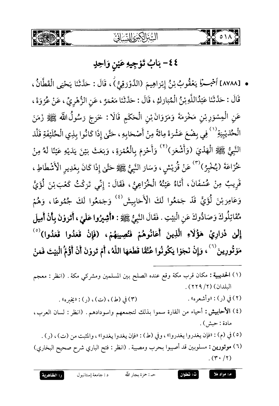 8788- أَخبَرنا يَعْقُوبُ بنُ إِبْرَاهِيمَ الدورقي، قَالَ: حَدثنا يَحيَى القَطَّانُ، قَالَ: حَدثنا عَبدُ اللهِ بنُ المُبَارَكِ، قَالَ: حَدثنا مَعْمَرٌ، عَنِ الزُّهْرِيِّ، عَن عُرْوَةَ، عَنِ المِسْوَرِ بنِ مَخْرَمَةَ، وَمَرْوَانِ بنِ الحَكَمِ قَالا: خَرَجَ رَسُولُ اللهِ صَلى الله عَلَيهِ وسَلم زَمَنَ الحُدَيْبِيَةِ فِي بِضْعِ عَشْرَةَ مِئَةٍ مِنْ أَصْحَابِهِ، حَتَّى إِذَا كَانُوا بِذِي الحُلَيْفَةِ، قَلَّدَ النَّبيُّ صَلى الله عَلَيهِ وسَلم الهَدْيَ، وَأَشْعَرَ، وَأَحْرَمَ بِالعُمْرَةِ، وَبَعَثَ بَيْنَ يَدَيْهِ عَيْنًا لَهُ مِنْ خُزَاعَةَ يُخْبِرُ عَن قُرَيْشٍ، وَسَارَ النَّبيُّ صَلى الله عَلَيهِ وسَلم حَتَّى إِذَا كَانَ بِغَدِيرِ الأَشْطَاطِ قَرِيبًا مِنْ عُسْفَانَ، أَتَاهُ عَيْنُهُ الخُزَاعِيُّ، فَقَالَ: إِنِّي تَرَكْتُ كَعْبَ بْنَ لُؤَيٍّ، وَعَامِرَ بْنَ لُؤَيٍّ قَدْ جَمَعُوا لَكَ الأَحَابِيشَ، وَجَمَعُوا لَكَ جُمُوعًا، وَهُمْ مُقَاتِلُوكَ وَصَادُّوكَ عَنِ البَيْتِ، فَقَالَ النَّبيُّ صَلى الله عَلَيهِ وسَلم: أَشِيرُوا عَلَيَّ، أَتَرَوْنَ بِأَنْ أَمِيلَ إِلَى ذَرَارِيِّ هَؤُلاءِ الَّذِينَ أَعَانُوهُمْ فَنُصِيبَهُمْ؟ فَإِنْ قَعَدُوا قَعَدُوا مَوْتُورِينَ، وَإِنْ نَجَوْا يَكُونُوا عُنُقًا قَطَعَهَا اللهُ، أَمْ تَرَوْنَ أَنْ أَؤُمَّ البَيْتَ، فَمَنْ صَدَّنَا عَنهُ قَاتَلْنَاهُ؟ فَقَالَ أَبو بَكْرٍ: اللهُ وَرَسُولُهُ أَعْلَمُ يَا نَبِيَّ اللهِ، إِنَّمَا جِئْنَا مُعْتَمِرِينَ وَلَمْ نَأْتِ لِقِتَالِ أَحَدٍ، وَلَكِنْ مَنْ حَالَ بَيْنَنَا وَبَيْنَ البَيْتِ قَاتَلْنَاهُ، فَقَالَ النَّبيُّ صَلى الله عَلَيهِ وسَلم: فَتَرَوَّحُوا إِذًا، مُخْتَصَرٌ.
