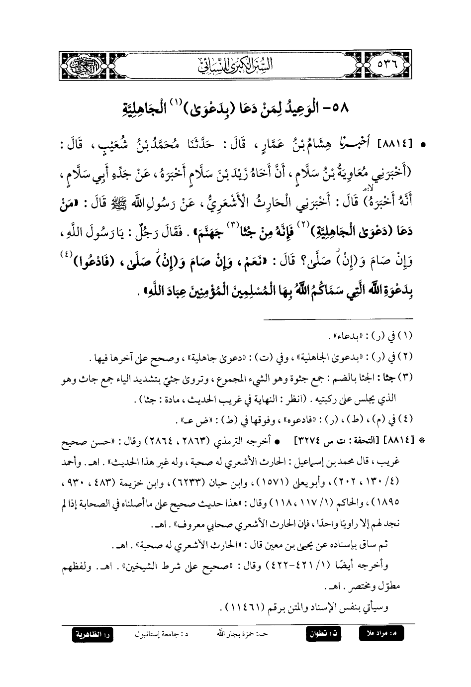 8814- أَخبَرنا هِشَامُ بنُ عَمَّارٍ، قَالَ: حَدثنا مُحَمدُ بنُ شُعَيْبٍ، قَالَ: أَخْبَرَنِي مُعاويَةُ بنُ سَلاَّمٍ، أَنَّ أَخَاهُ زَيْدَ بْنَ سَلاَّمٍ أَخْبَرَهُ عَن جَدِّهِ أَبي سَلاَّمٍ، أَنَّهُ أَخْبَرَهُ قَالَ: أَخْبَرَنِي الحَارِثُ الأَشْعَرِيُّ، عَن رَسُولِ اللهِ صَلى الله عَلَيهِ وسَلم قَالَ: مَنْ دَعَا دَعْوَى الجَاهِلِيَّةِ، فَإِنَّهُ مِنْ جُثَا جَهَنَّمَ، فَقَالَ رَجُلٌ: يَا رَسُولَ اللهِ، وَإِنْ صَامَ وَإِنْ صَلَّى؟ قَالَ: نَعَمْ، وَإِنْ صَامَ وَإِنْ صَلَّى، فَادْعُوا بِدَعْوَةِ اللهِ الَّتِي سَمَّاكُمُ اللهُ بِهَا المُسْلِمِينَ المُؤْمِنِينَ عِبَادَ اللهِ.