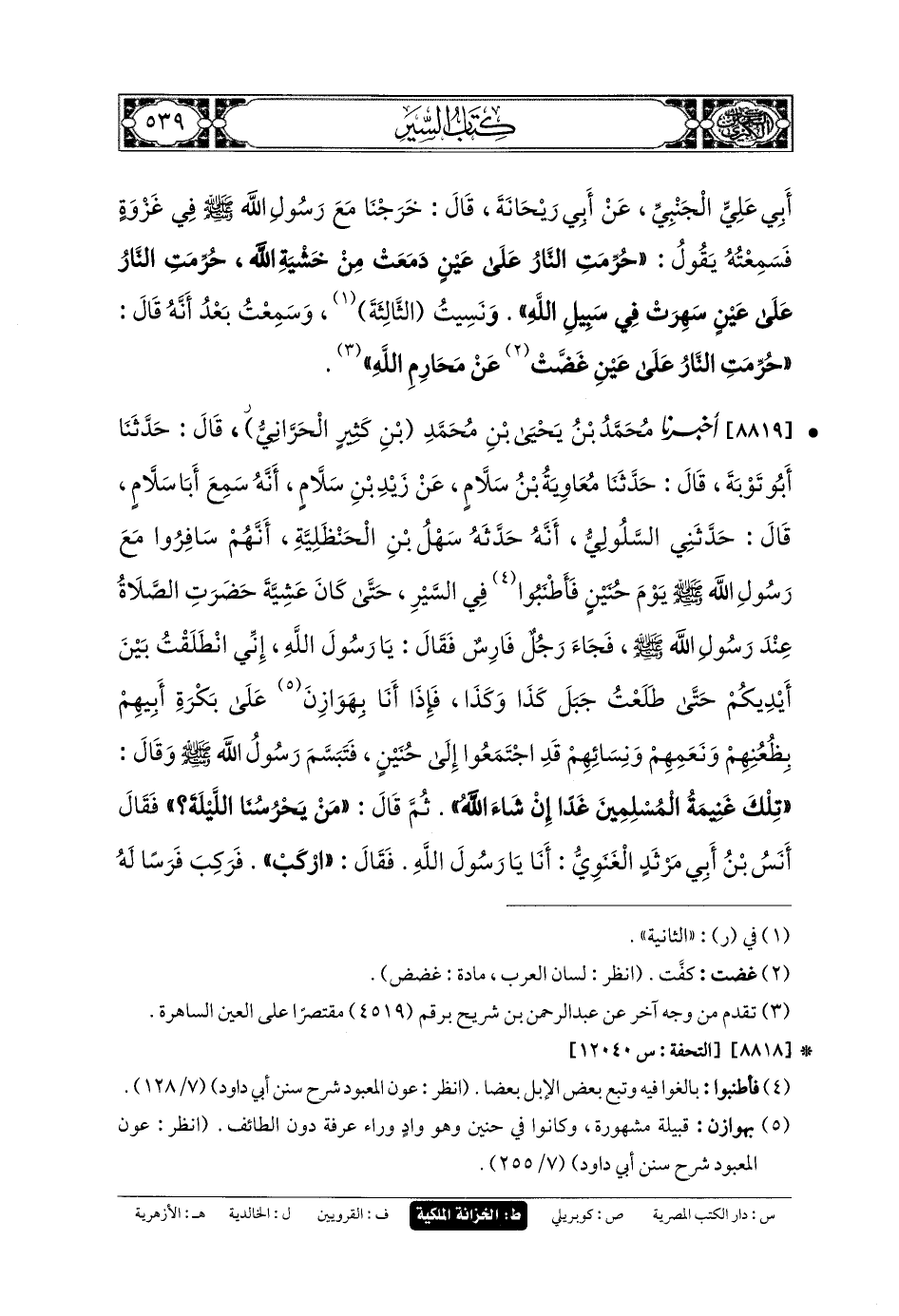 8819- أَخبَرنا مُحَمدُ بنُ يَحيَى بنِ مُحَمدٍ بن كثير الحراني، قَالَ: حَدثنا أَبو تَوْبَةَ، قَالَ: حَدثنا مُعاويَةُ بنُ سَلاَّمٍ، عَن زَيْدِ بنِ سَلاَّمٍ، أَنَّهُ سَمِعَ أَبَا سَلاَّمٍ، قَالَ: حَدَّثني السَّلُولِيُّ، أَنَّهُ حَدَّثَهُ سَهْلُ بنُ الحَنْظَلِيَّةِ، أَنَّهُمْ سَافِرُوا مَعَ رَسُولِ اللهِ صَلى الله عَلَيهِ وسَلم يَوْمَ حُنَيْنٍ، فَأَطْنَبُوا فِي السَّيْرِ حَتَّى كَانَ عَشِيَّةً حَضَرَتِ الصَّلاةُ عِنْدَ رَسُولِ اللهِ صَلى الله عَلَيهِ وسَلم، فَجَاءَ رَجُلٌ فَارِسٌ فَقَالَ: يَا رَسُولَ اللهِ، إِنِّي انْطَلَقْتُ بَيْنَ أَيْدِيكُمْ حَتَّى طَلَعْتُ جَبَلَ كَذَا وَكَذَا، فَإِذَ أَنَا بِهَوَازِنَ عَلَى بَكْرَةِ أَبيهِمْ بِظُعُنِهِمْ وَنَعَمِهِمْ وَنِسَائِهِمْ قَدِ اجْتَمَعُوا إِلَى حُنَيْنٍ، فَتَبَسَّمَ رَسُولُ اللهِ صَلى الله عَلَيهِ وسَلم وَقَالَ: تِلْكَ غَنِيمَةُ المُسْلِمِينَ غَدًا، إِنْ شَاءَ اللهُ، ثُمَّ قَالَ: مَنْ يَحْرُسُنَا اللَّيْلَةَ؟ فَقَالَ: أَنَسُ بنُ أَبي مَرْثَدٍ الغَنَوِيُّ: أَنَا يَا رَسُولَ اللهِ، فَقَالَ: ارْكَبْ، فَرَكِبَ فَرَسًا لَهُ فَجَاءَ إِلَى رَسُولِ اللهِ صَلى الله عَلَيهِ وسَلم فَقَالَ لَهُ: رَسُولُ اللهِ صَلى الله عَلَيهِ وسَلم: اسْتَقْبِلْ هَذَا الشِّعْبَ حَتَّى تَكُونَ فِي أَعْلاهُ، وَلا نُغَرَّنَّ مِنْ قِبَلِكَ اللَّيْلَةَ،
