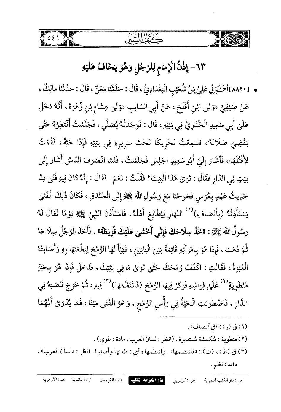 8820- أَخبَرنا عَليُّ بنُ شُعَيْبٍ البَغْدَادِيُّ، قَالَ: حَدثنا مَعْنٌ، قَالَ: حَدثنا مَالِكٌ، عَن صَيْفِيٍّ، مَوْلَى ابنِ أَفْلَحَ، عَنِ أَبي السَّائِبِ، مَوْلَى هِشَامِ بنِ زُهْرَةَ، أَنَّهُ دَخَلَ عَلَى أَبي سَعِيدٍ الخُدْرِيِّ فِي بَيْتِهِ قَالَ: فَوَجَدْتُهُ يُصَلِّي، فَجَلَسْتُ أَنْتَظِرُهُ حَتَّى يَقْضِيَ صَلاتَهُ، فَسَمِعْتُ تَحْرِيكًا تَحْتَ سَرِيرِهِ فِي بَيْتِهِ، فَإِذَا حَيَّةٌ، فَقُمْتُ لأَقْتُلَهَا، فَأَشَارَ إِلَيَّ أَبو سَعِيدٍ اجْلِسْ، فَجَلَسْتُ، فَلَمَّا انْصَرَفَ الناس أَشَارَ إِلَى بَيْتٍ فِي الدَّارِ، فَقَالَ: تَرَى هَذَا البَيْتَ؟ فَقُلْتُ: نَعَمْ، فَقَالَ: إِنَّهُ كَانَ فِيهِ فَتًى مِنَّا حَدِيثُ عَهْدٍ بِعُرْسٍ، فَخَرَجْنَا مَعَ رَسُولِ اللهِ صَلى الله عَلَيهِ وسَلم إِلَى الخَنْدَقِ، فَكَانَ ذَلِكَ الفَتَى يَسْتَأْذِنُهُ بِأَنْصَافِ النَّهَارِ ليُطَالِعُ أَهْلَهُ، فَاسْتَأْذَنَ النَّبيَّ صَلى الله عَلَيهِ وسَلم يَوْمًا، فَقَالَ لَهُ رَسُولُ اللهِ صَلى الله عَلَيهِ وسَلم: خُذْ سِلاحَكَ، فَإِنِّي أَخْشَى عَلَيْكَ قُرَيْظَةَ، فَأَخَذَ الرَّجُلُ سِلاحَهُ، ثُمَّ ذَهَبَ، فَإِذَا هُوَ بِامْرَأَتِهِ قَائِمَةٌ بَيْنَ البَابَيْنِ، فَهَيَّأَ لَهَا الرُّمْحَ لِيَطْعَنَهَا بِهِ، وَأَصَابَتْهُ الغَيْرَةُ، فَقَالَتْ: اكْفُفْ رُمْحَكَ حَتَّى تَرَى مَا فِي بَيْتِكَ، فَدَخَلَ، فَإِذَا هُوَ بِحَيَّةٍ مُنْطَوِيَةٍ عَلَى فِرَاشِهِ، فَرَكَزَ فِيهَا الرُّمْحَ، فَانْتَظَمَهَا فِيهِ، ثُمَّ خَرَجَ فَنَصَبَهُ فِي الدَّارِ، فَاضْطَرَبَتِ الحَيَّةُ فِي رَأْسِ الرُّمْحِ، وَخَرَّ الفَتَى مَيِّتًا، فَمَا يُدْرَى أَيُّهُمَا كَانَ أَسْرَعَ مَوْتًا، الفَتَى أَمِ الحَيَّةُ؟ فَجِئْنَا رَسُولَ اللهِ صَلى الله عَلَيهِ وسَلم فَذَكَرْنَا ذَلِكَ لَهُ، وَقُلْنَا: يَا رَسُولَ اللهِ، ادْعُ اللهَ لَهُ أَنْ يُحْيِيَهُ، فَقَالَ: اسْتَغْفِرُوا لِصَاحِبِكُمْ، ثُمَّ قَالَ: إِنَّ بِالمَدِينَةِ جِنًّا قَدْ أَسْلَمُوا، فَمَنْ بَدَا لَكُمْ مِنْهُمْ فَآذِنُوهُ ثَلاثًا، فَإِنْ عَادَ فَاقْتُلُوهُ، فَإِنَّمَا هُوَ شَيْطَانٌ.
