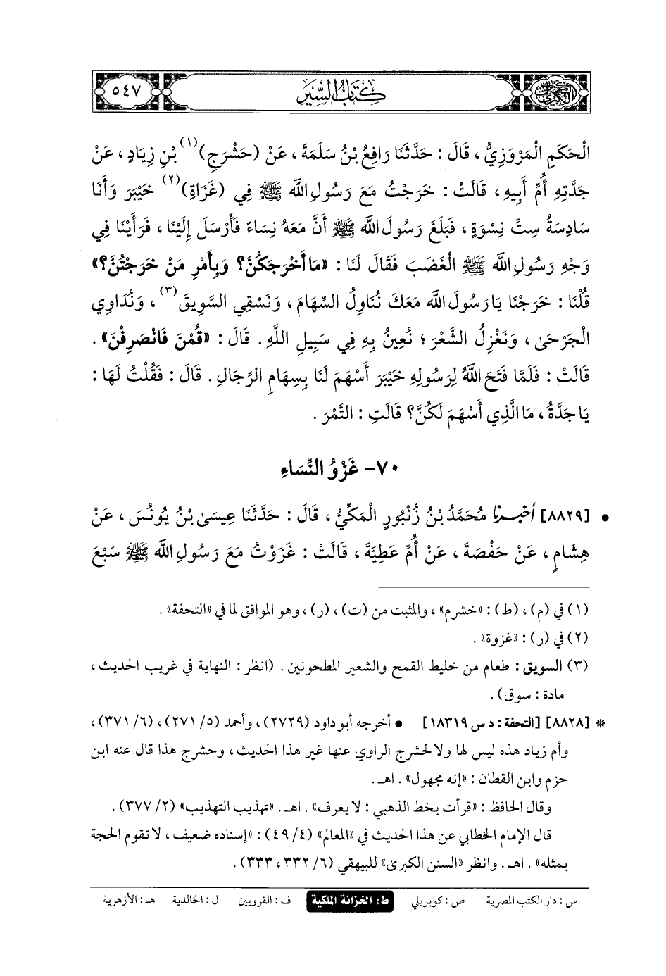 8829- أَخبَرنا مُحَمدُ بنُ زُنْبُورٍ المَكِّيُّ، قَالَ: حَدثنا عِيسَى بنُ يُونُسَ، عَن هِشَامٍ، عَن حَفْصَةَ، عَن أُمِّ عَطِيَّةَ قَالَتْ: غَزَوْتُ مَعَ رَسُولِ اللهِ صَلى الله عَلَيهِ وسَلم سَبْعَ غَزَوَاتٍ كُنْتُ أَخْلُفُهُمْ فِي الرِّحَالِ، وَأَصْنَعُ طَعَامَهُمْ، وَأُدَاوِي الجَرْحَى.