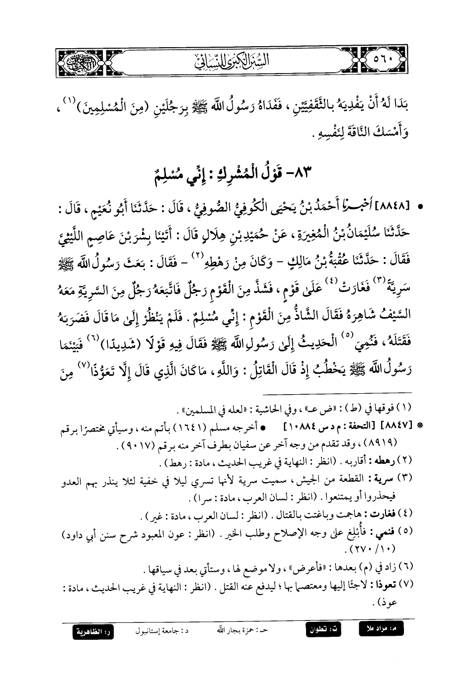 8848- أَخْبَرَنِي أَحْمَدُ بنُ يَحيَى الكُوفِيُّ الصُّوفِيُّ، قَالَ: حَدثنا أَبو نُعَيْمٍ، قَالَ: حَدثنا سُلَيمَانُ بنُ المُغِيرَةِ، عَن حُمَيْدِ بنِ هِلالٍ قَالَ: أَتَيْنَا بِشْرَ بْنَ عَاصِمٍ اللَّيْثِيَّ فَقَالَ: حَدثنا عُقْبَةُ بنُ مَالِكٍ، وَكَانَ مِنْ رَهْطِهِ فقَالَ: بَعَثَ رَسُولُ اللهِ صَلى الله عَلَيهِ وسَلم سَرِيَّةً، فَغَارَتْ عَلَى قَوْمٍ، فَشَذَّ مِنَ القَوْمِ رَجُلٌ، فَاتَّبَعَهُ رَجُلٌ مِنَ السَّرِيَّةِ مَعَهُ السَّيْفُ شَاهِرُهُ، فَقَالَ الشَّاذُّ مِنَ القَوْمِ: إِنِّي مُسْلِمٌ، فَلَمْ يَنْظُرْ إِلَى مَا قَالَ: فَضَرَبَهُ، فَقَتَلَهُ، فَنُمِي الحَدِيثُ إِلَى رَسُولِ اللهِ صَلى الله عَلَيهِ وسَلم، فَقَالَ فِيهِ قَوْلاً شَدِيدًا: فَبَيْنَمَا رَسُولُ اللهِ صَلى الله عَلَيهِ وسَلم يَخْطُبُ إِذْ قَالَ القَاتِلُ: وَاللهِ مَا كَانَ الَّذِي قَالَ إِلاَّ تَعَوُّذًا مِنَ القَتْلِ، فَأَعْرَضَ عَنهُ رَسُولُ اللهِ صَلى الله عَلَيهِ وسَلم، وَعَمَّنْ قِبَلَهُ مِنَ النَّاسِ، وَأَخَذَ فِي خُطْبَتِهِ، ثُمَّ قَالَ: يَا رَسُولَ اللهِ، وَاللهِ مَا قَالَ الَّذِي قَالَ إِلاَّ تَعَوُّذًا مِنَ القَتْلِ فَأَعْرَضَ عَنهُ، وَعَمَّنْ قِبَلَهُ مِنَ النَّاسِ، وَأَخَذَ فِي خُطْبَتِهِ وَلَمْ يَصْبِرْ، فَقَالَ فِي الثَّالِثَةَ مِثْلَ ذَلِكَ، فَأَقْبَلَ عَلَيْهِ رَسُولُ اللهِ صَلى الله عَلَيهِ وسَلم، تُعْرَفُ المَسَاءَةَ فِي وَجْهِهِ، فَقَالَ: إِنَّ اللهَ أَبَى عَلَيَّ الَّذِي قَتَلَ مُؤْمِنًا ثَلاثَ مَرَّاتٍ.