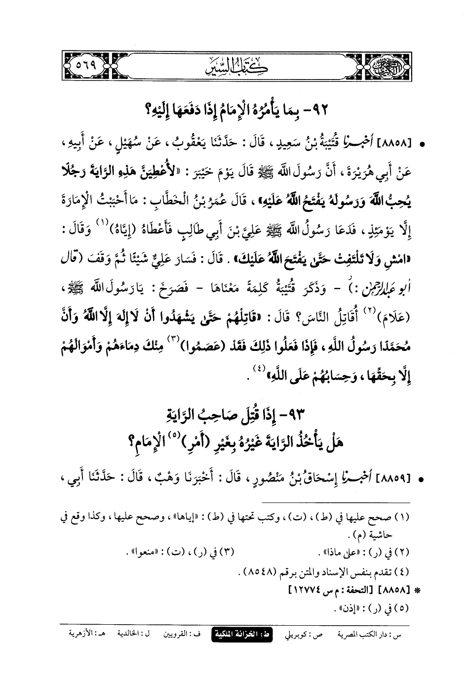 8858- أَخبَرنا قُتَيبَةُ بنُ سَعِيدٍ، قَالَ: حَدثنا يَعْقُوبُ، عَن سُهَيلٍ، عَن أَبيهِ، عَن أَبي هُرَيْرَةَ، أَنَّ رَسُولَ اللهِ صَلى الله عَلَيهِ وسَلم قَالَ يَوْمَ خَيْبَرَ: لأُعْطِيَنَّ هَذِهِ الرَّايَةَ رَجُلاً يُحِبُّ اللهَ وَرَسُولَهُ يَفْتَحُ اللهُ عَلَيْهِ، قَالَ عُمَرُ بنُ الخَطَّابِ: مَا أَحْبَبْتُ الإِمَارَةَ إِلاَّ يَوْمَئِذٍ، فَدَعَا رَسُولُ اللهِ صَلى الله عَلَيهِ وسَلم عَليَّ بْنَ أَبي طَالِبٍ فَأَعْطَاهُ إِيَّاهُ، وَقَالَ: امْشِ، وَلا تَلْتَفِتْ حَتَّى يَفْتَحَ اللهُ عَلَيْكَ، فَسَارَ عَليٌّ شَيْئًا، ثُمَّ وَقَفَ، قال أبو عبد الرحمن: وَذَكَرَ قُتَيبَةُ كَلِمَةً مَعْنَاهَا فَصَرَخَ: يَا رَسُولَ اللهِ، عَلَى مَا أُقَاتِلُ النَّاسَ؟ قَالَ: قَاتِلْهُمْ حَتَّى يَشْهَدُوا أَنْ لا إِلَهَ إِلاَّ اللهُ، وَأَنَّ مُحَمدًا رَسُولُ اللهِ، فَإِذَا فَعَلُوا ذَلِكَ، فَقَدْ عَصَمُوا مِنْكَ دِمَاءَهُمْ وَأَمْوَالَهُمْ إِلاَّ بِحَقِّهَا، وَحِسَابُهُمْ عَلَى اللهِ.