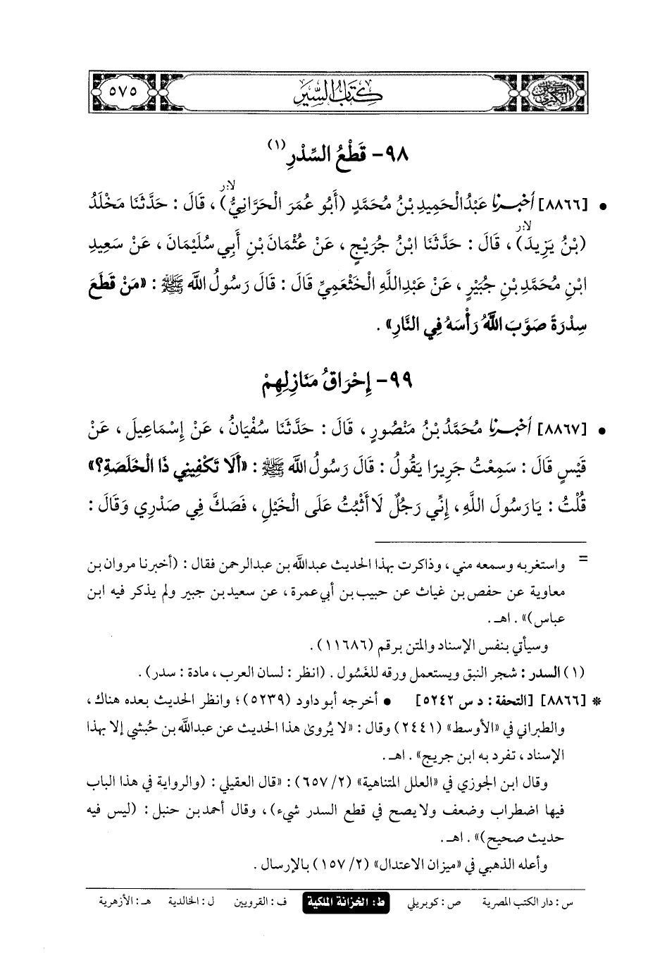 8866- أَخبَرنا عَبدُ الحَمِيدِ بنُ مُحَمدِ أَبو عُمَرَ الحَرَّانِيُّ، قَالَ: حَدثنا مَخْلَدُ بنُ يَزِيدَ، قَالَ: حَدثنا ابنُ جُرَيْجٍ، عَن عُثْمَانَ بنِ أَبي سُلَيمَانَ، عَن سَعِيدِ بنِ مُحَمدِ بنِ جُبَيْرٍ، عَن عَبدِ اللهِ الخَثْعَمِيِّ قَالَ: قَالَ رَسُولُ اللهِ صَلى الله عَلَيهِ وسَلم: مَنْ قَطَعَ سِدْرَةً صَوَّبَ اللهُ رَأْسَهُ فِي النَّارِ.