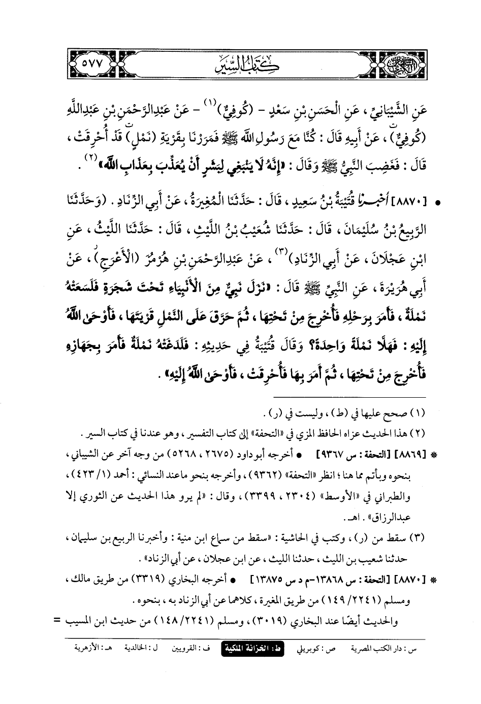 8870- أَخبَرنا قُتَيبَةُ بنُ سَعِيدٍ، قَالَ: حَدثنا المُغِيرَةُ، عَن أَبي الزِّنَادِ، وَحَدثنا الرَّبِيعُ بنُ سُلَيمَانَ، قَالَ: حَدثنا شُعَيْبُ بنُ اللَّيْثِ، قَالَ: حَدثنا اللَّيْثُ، عَنِ ابنِ عَجْلانَ، عَن أَبي الزِّنَادِ، عَن عَبدِ الرَّحمَنِ بنِ هُرْمُزَ الأعرج، عَن أَبي هُرَيْرَةَ، عَنِ النَّبيِّ صَلى الله عَلَيهِ وسَلم قَالَ: نَزَلَ نَبِيٌّ مِنَ الأَنْبِيَاءِ تَحْتَ شَجَرَةٍ، فَلَسَعَتْهُ نَمْلَةٌ، فَأَمَرَ بِرَحْلِهِ فَأُخْرِجَ مِنْ تَحْتِهَا، ثُمَّ حَرَّقَ عَلَى النَّمْلِ قَرْيَتَهَا، فَأَوْحَى اللهُ إِلَيْهِ: فَهَلاَّ نَمْلَةً وَاحِدَةً.