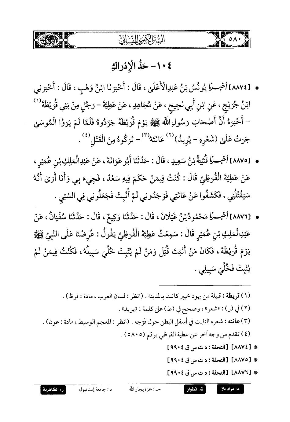 8874- أَخبَرنا يُونُسُ بنُ عَبدِ الأَعْلَى، قَالَ: أَخبَرنا ابنُ وَهْبٍ، قَالَ: أَخْبَرَنِي ابنُ جُرَيْجٍ، عَنِ ابنِ أَبي نَجِيحٍ، عَن مُجَاهِدٍ، عَن عَطِيَّةَ، رَجُلٌ مِنْ بَنِي قُرَيْظَةَ أَخْبَرَهُ؛ أَنَّ أَصْحَابَ رَسُولِ اللهِ صَلى الله عَلَيهِ وسَلم يَوْمَ قُرَيْظَةَ جَرَّدُوهُ، فَلَمَّا لَمْ يَرَوِا المُوسَى جَرَتْ عَلَى شَعْرِهِ، يُرِيدُ عَانَتَهُ، تَرَكُوهُ مِنَ القَتْلِ.