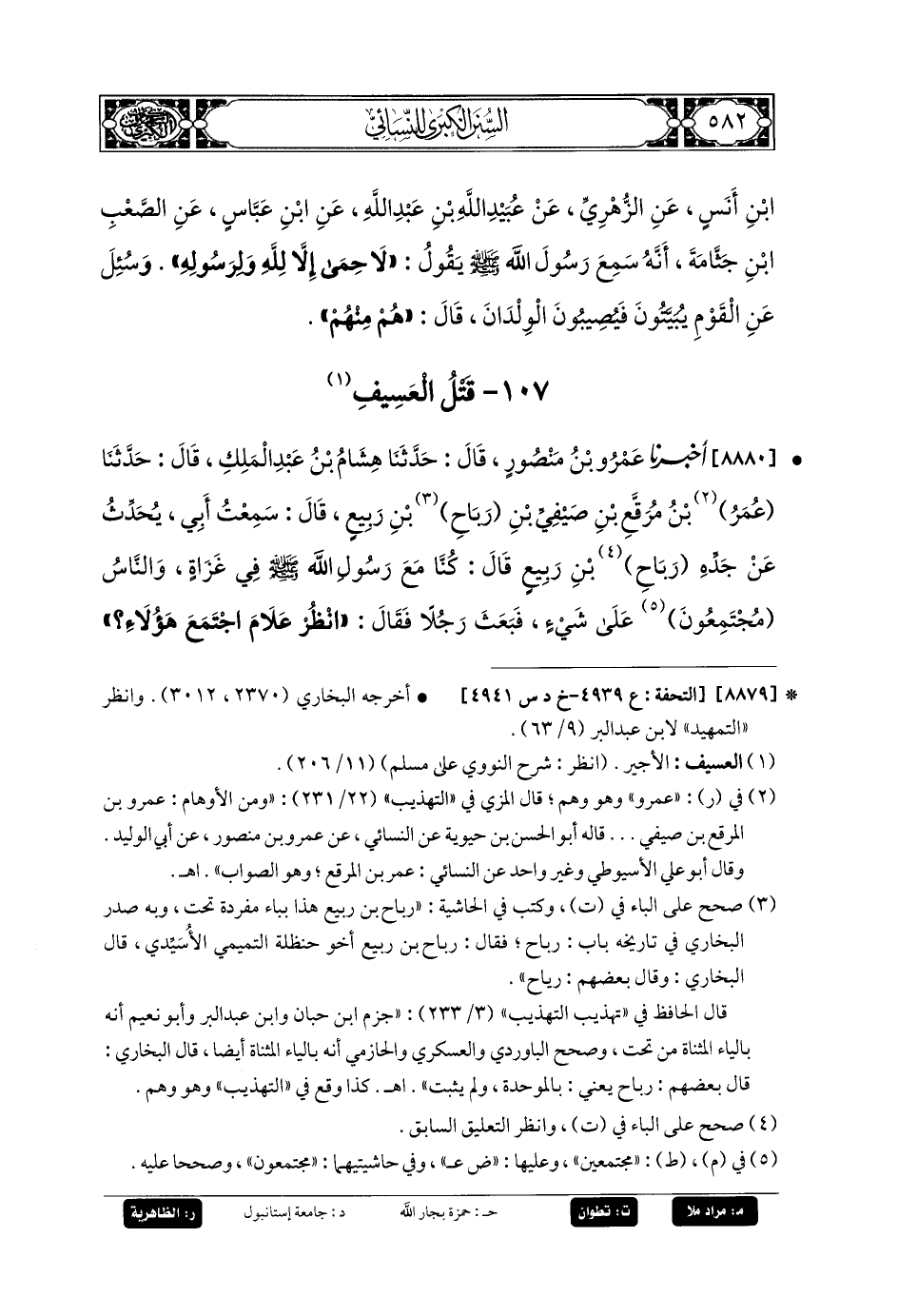 8880- أَخبَرنا عَمْرُو بنُ مَنصُورٍ، قَالَ: حَدثنا هِشَامُ بنُ عَبدِ المَلِكِ، قَالَ: حَدثنا عُمَرُ بنُ مُرَقَّعِ بنِ صَيْفِيِّ بنِ رَبَاحِ بنِ رَبِيعٍ، قَالَ: سَمِعْتُ أَبي يُحَدِّثُ عَن جَدِّهِ رَبَاحِ بنِ رَبِيعٍ قَالَ: كُنَّا مَعَ رَسُولِ اللهِ صَلى الله عَلَيهِ وسَلم فِي غَزَاةٍ، وَالنَّاسُ مُجْتَمِعُونَ عَلَى شَيْءٍ، فَبَعَثَ رَجُلاً فَقَالَ: انْظُرْ عَلامَ اجْتَمَعَ هَؤُلاءِ؟ فَجَاءَ فَقَالَ: عَلَى امْرَأَةٍ قَتِيلٍ، فَقَالَ: مَا كَانَتْ هَذِهِ تُقَاتِلُ، وَخَالِدُ بنُ الوَلِيدِ عَلَى المُقَدَّمَةِ فَقَالَ: قُلْ لِخَالِدٍ: لا تَقْتُلَنَّ ذُرِّيَّةً وَلا عَسِيفًا.