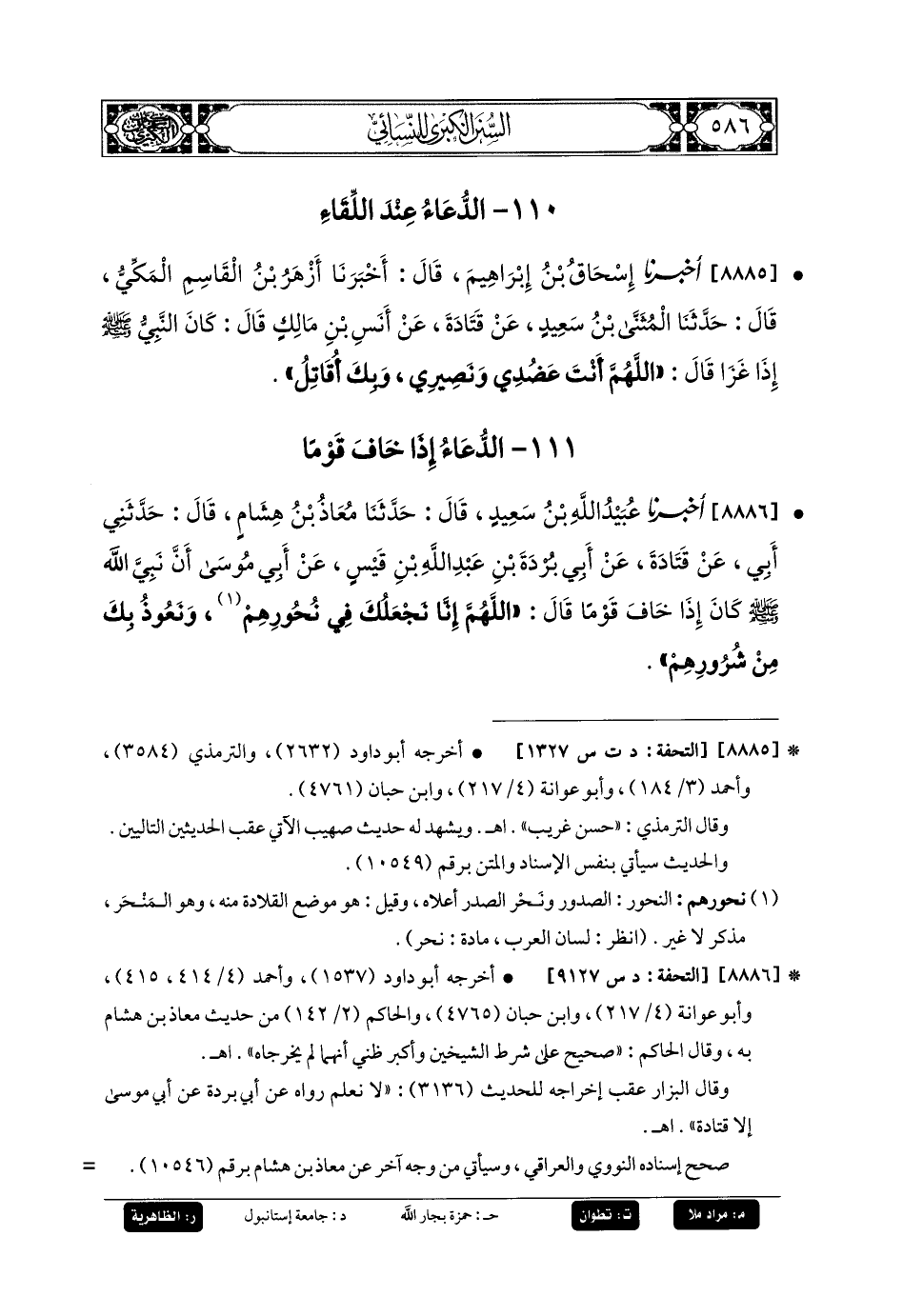 8886- أَخبَرنا عُبَيدُ اللهِ بنُ سَعِيدٍ، قَالَ: حَدثنا مُعَاذُ بنُ هِشَامٍ، قَالَ: حَدَّثني أَبي، عَن قَتَادَةَ، عَن أَبي بُرْدَةَ بنِ عَبدِ اللهِ بنِ قَيْسٍ، عَن أَبي مُوسَى، أَنَّ نَبِيَّ اللهِ صَلى الله عَلَيهِ وسَلم كَانَ إِذَا خَافَ قَوْمًا قَالَ: اللهُمَّ إِنَّا نَجْعَلُكَ فِي نُحُورِهِمْ، وَنَعُوذُ بِكَ مِنْ شُرُورِهِمْ.