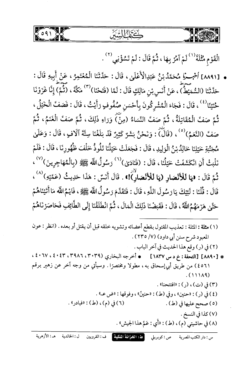 8891- أَخبَرنا مُحَمدُ بنُ عَبدِ الأَعْلَى، قَالَ: حَدثنا المُعْتَمِرُ، عَن أَبيهِ، قَالَ: حَدثنا السُّمَيْطُ، عَن أَنَسِ بنِ مَالِكٍ قَالَ: لَمَّا افْتَتَحْنَا مَكَّةَ، ثُمَّ إِنَّا غَزَوْنَا حُنَيْنًا، قَالَ: فَجَاءَ المُشْرِكُونَ بِأَحْسَنِ صُفُوفٍ رَأَيْتُ، قَالَ: فَصَفُّ الخَيْلِ، ثُمَّ صَفُّ المُقَاتِلَةِ، ثُمَّ صَفُّ النِّسَاءِ مِنْ وَرَاءِ ذَلِكَ، ثُمَّ صَفُّ الغَنَمِ، ثُمَّ صَفُّ النَّعَمِ، قَالَ: وَنَحْنُ بَشَرٌ كَثِيرٌ، قَدْ بَلَغْنَا سِتَّةَ آلافٍ، قَالَ: وَعَلَى مَجْنَبَةِ خَيْلِنَا خَالِدُ بنُ الوَلِيدِ، قَالَ: فَجَعَلَتْ خَيْلُنَا تَلُوذُ خَلْفَ ظُهُورِنَا، قَالَ: فَلَمْ نَلْبَثْ أَنِ انْكَشَفَ خَيْلُنَا، قَالَ: فَنَادَى رَسُولُ اللهِ صَلى الله عَلَيهِ وسَلم: يَا لِلْمُهَاجِرِينَ، ثُمَّ قَالَ: يَا لِلأَنْصَارِ، يَا لِلأَنْصَارِ، قَالَ أَنَسٌ: هَذَا حَدِيثُ عِمِّيَّةٌ، قَالَ: قُلْنَا: لَبَّيْكَ يَا رَسُولَ اللهِ، قَالَ: فَتَقَدَّمَ رَسُولُ اللهِ صَلى الله عَلَيهِ وسَلم، فَايْمُ اللهِ مَا أَتَيْنَاهُمْ حَتَّى هَزَمَهُمُ اللهُ، قَالَ: فَقَبَضْنَا ذَلِكَ المَالَ، ثُمَّ انْطَلَقْنَا إِلَى الطَّائِفِ، فَحَاصَرْنَاهُمْ أَرْبَعِينَ لَيْلَةً، ثُمَّ رَجَعْنَا إِلَى مَكَّةَ، فَنَزَلْنَا، فَجَعَلَ رَسُولُ اللهِ صَلى الله عَلَيهِ وسَلم يُعْطِي الرَّجُلَ المِئَةَ وَيُعْطِي الرَّجُلَ المِئَةَ ... مُخْتَصَرٌ.