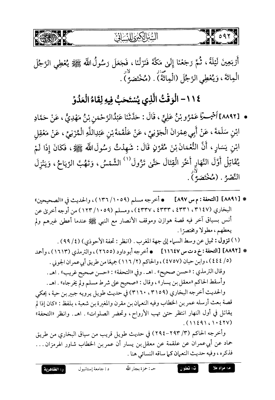 8892- أَخبَرنا عَمْرُو بنُ عَليٍّ، قَالَ: حَدثنا عَبدُ الرَّحمَنِ بنُ مَهْدِيٍّ، عَن حَمَّادِ بنِ سَلَمَةَ، عَن أَبي عِمْرَانَ الجَوْنِيِّ، عَن عَلْقَمَةَ بنِ عَبدِ اللهِ المُزَنِيِّ، عَن مَعْقِلِ بنِ يَسَارٍ، أَنَّ النُّعْمَانَ بْنَ مُقَرِّنٍ قَالَ: شَهِدْتُ رَسُولَ اللهِ صَلى الله عَلَيهِ وسَلم، فَكَانَ إِذَا لَمْ يُقَاتِلْ أَوَّلَ النَّهَارِ أَخَّرَ القِتَالَ، حَتَّى تَزُولَ الشَّمْسُ، وَتَهُبَّ الرِّيَاحُ، وَيَنْزِلَ النَّصْرُ، مُخْتَصَرٌ.