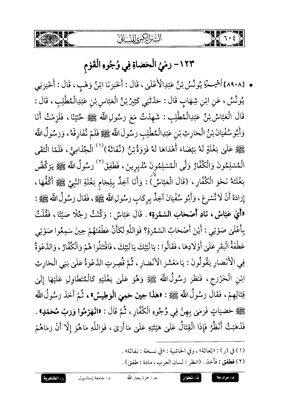 8908- أَخبَرنا يُونُسُ بنُ عَبدِ الأَعْلَى، قَالَ: أَخبَرنا ابنُ وَهْبٍ، قَالَ: أَخْبَرَنِي يُونُسُ، عَنِ ابنِ شِهَابٍ، قَالَ: حَدَّثني كَثِيرُ بنُ العَبَّاسِ بنِ عَبدِ المُطَّلِبِ قَالَ: قَالَ العَبَّاسُ بنُ عَبدِ المُطَّلِبِ: شَهِدْتُ مَعَ رَسُولِ اللهِ صَلى الله عَلَيهِ وسَلم حُنَيْنًا، فَلَزِمْتُ أَنَا وَأَبو سُفيانَ بنُ الحَارِثِ بنِ عَبدِ المُطَّلِبِ رَسُولَ اللهِ صَلى الله عَلَيهِ وسَلم فَلَمْ نُفَارِقْهُ، وَرَسُولُ اللهِ صَلى الله عَلَيهِ وسَلم عَلَى بَغْلَةٍ لَهُ بَيْضَاءَ، أَهْدَاهَا لَهُ فَرْوَةُ بنُ نُفَاثَةَ الجُذَامِيُّ، فَلَمَّا التَقَى المُسْلِمُونَ وَالكُفَّارُ، وَلَّى المُسْلِمُونَ مُدْبِرِينَ، فَطَفِقَ رَسُولُ اللهِ صَلى الله عَلَيهِ وسَلم يُرْكِضُ بَغْلَتَهُ نَحْوَ الكُفَّارِ، قَالَ العَبَّاسُ: وَأَنَا آخِذٌ بِلِجَامِ بَغْلَةِ النَّبيِّ صَلى الله عَلَيهِ وسَلم أَكُفُّهَا إِرَادَةَ أَنْ لا تُسْرِعَ، وَأَبو سُفيانَ آخُذٌ بِرِكَابِ رَسُولِ اللهِ صَلى الله عَلَيهِ وسَلم، فَقَالَ رَسُولُ اللهِ صَلى الله عَلَيهِ وسَلم: أَيْ عَبَّاسُ، نَادِ أَصْحَابَ السَّمُرَةِ، قَالَ عَبَّاسٌ: وَكُنْتُ رَجُلاً صَيِّتًا، فَقُلْتُ بِأَعْلَى صَوْتِي: أَيْنَ أَصْحَابُ السَّمُرَةِ؟ فَوَاللَّهِ لَكَأَنَّ عَطْفَتَهُمْ حِينَ سَمِعُوا صَوْتِي عَطْفَةُ البَقَرِ عَلَى أَوْلادِهَا، فَقَالُوا: يَا لَبَّيْكَ، يَا لَبَّيْكَ، فَاقْتَتَلُوا هُمْ وَالكُفَّارُ، وَالدَّعْوَةُ فِي الأَنْصَارِ يَقُولُونَ: يَا مَعْشَرَ الأَنْصَارِ، ثُمَّ قُصِرَتِ الدَّعْوَةُ عَلَى بَنِي الحَارِثِ بنِ الخَزْرَجِ، فَنَظَرَ رَسُولُ اللهِ صَلى الله عَلَيهِ وسَلم وَهُوَ عَلَى بَغْلَتِهِ كَالمُتَطَاوِلِ عَلَيْهَا إِلَى قِتَالِهِمْ، فَقَالَ رَسُولُ اللهِ صَلى الله عَلَيهِ وسَلم: هَذَا حِينَ حَمِيَ الوَطِيسُ، ثُمَّ أَخَذَ رَسُولُ اللهِ صَلى الله عَلَيهِ وسَلم حَصَيَاتٍ، فَرَمَى بِهِنَّ فِي وُجُوهِ الكُفَّارِ، ثُمَّ قَالَ: انْهَزَمُوا وَرَبِّ مُحَمدٍ، فَذَهَبْتُ أَنْظُرُ، فَإِذَا القِتَالُ عَلَى هَيْئَتِهِ عَلَى مَا أَرَى، فَوَاللَّهِ مَا هُوَ إِلاَّ أَنْ رَمَاهُمْ رَسُولُ اللهِ صَلى الله عَلَيهِ وسَلم بِحَصَيَاتِهِ، فَمَا زِلْتُ أَرَى حَدَّهُمْ كَلِيلاً، وَأَمْرَهُمْ مُدْبِرًا، حَتَّى، يَعْنِي هَزَمَهُمُ اللهُ.