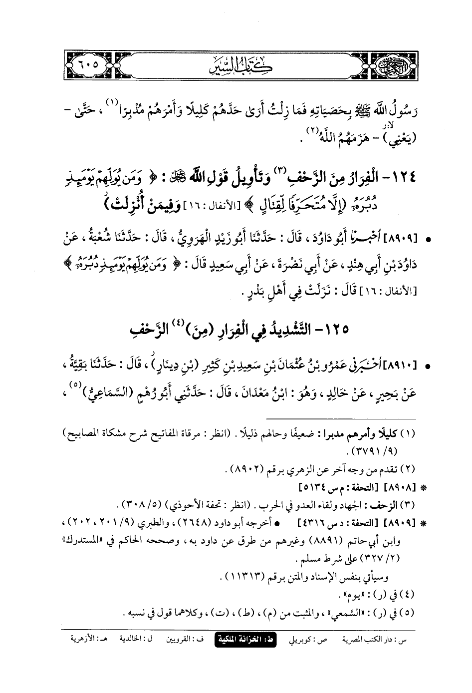 124- الفِرَارُ مِنَ الزَّحْفِ، وَتَأْوِيلُ قَوْلِ اللهِ عَزَّ وَجَلَّ: {وَمَنْ يُوَلِّهِمْ يَوْمَئِذٍ دُبُرَهُ إِلاَّ مُتَحَرِّفًا لِقِتَالٍ} وَفِيمَنْ أُنْزِلَتْ.