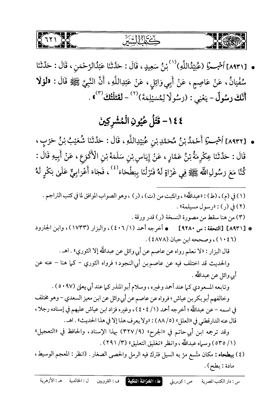8931- أَخبَرنا عُبَيدُ اللهِ بنُ سَعِيدٍ، قَالَ: حَدثنا عَبدُ الرَّحمَنِ، قَالَ: حَدثنا سُفيانُ، عَن عَاصِمٍ، عَن أَبي وَائِلٍ، عَن عَبدِ اللهِ، أَنَّ النَّبيَّ صَلى الله عَلَيهِ وسَلم قَالَ: لَوْلا أَنَّكَ رَسُولٌ، يَعْنِي رَسُولاً لمُسَيْلِمَةَ، لَقَتَلْتُكَ.