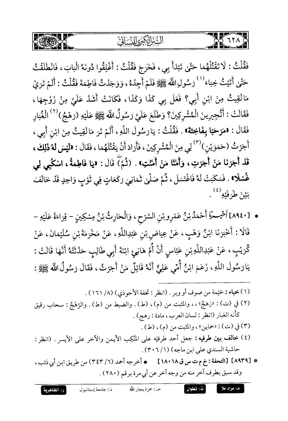8940- أَخبَرنا أَحْمَدُ بنُ عَمْرِو بنِ السَّرْحِ، وَالحَارِثُ بنُ مِسْكِينٍ، قِرَاءَةً عَلَيْهِ، قَالا: أَخبَرنا ابنُ وَهْبٍ، عَن عِيَاضِ بنِ عَبدِ اللهِ، عَن مَخْرَمَةَ بنِ سُلَيمَانَ، عَن كُرَيْبٍ، عَن عَبدِ اللهِ بنِ عَبَّاسٍ، أَنَّ أُمَّ هَانِئٍ ابنَةَ أَبي طَالِبٍ حَدَّثَتْهُ، أَنَّهَا قَالَتْ: يَا رَسُولَ اللهِ، زَعَمَ ابنُ أُمِّي عَليٌّ أَنَّهُ قَاتِلٌ مَنْ أَجَرْتُ، فَقَالَ رَسُولُ اللهِ صَلى الله عَلَيهِ وسَلم: قَدْ أَجَرْنَا مَنْ أَجَرْتِ.