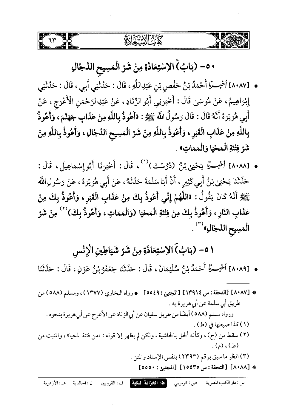 8088- أَخبَرنا يَحيَى بنُ دُرُسْتَ، قَالَ: أَخبَرنا أَبو إِسمَاعِيلَ، قَالَ: حَدثنا يَحيَى بنُ أَبي كَثِيرٍ، أَنَّ أَبَا سَلَمَةَ حَدَّثَهُ عَن أَبي هُرَيْرَةَ، عَن رَسُولِ اللهِ صَلى الله عَلَيهِ وسَلم أَنَّهُ كَانَ يَقُولُ: اللهُمَّ إِنِّي أَعُوذُ بِكَ مِنْ عَذَابِ القَبْرِ، وَأَعُوذُ بِكَ مِنْ عَذَابِ النَّارِ، وَأَعُوذُ بِكَ مِنْ فِتْنَةِ المَحْيَا وَالمَمَاتِ، وَأَعُوذُ بِكَ مِنْ شَرِّ المَسِيحِ الدَّجَّالِ.