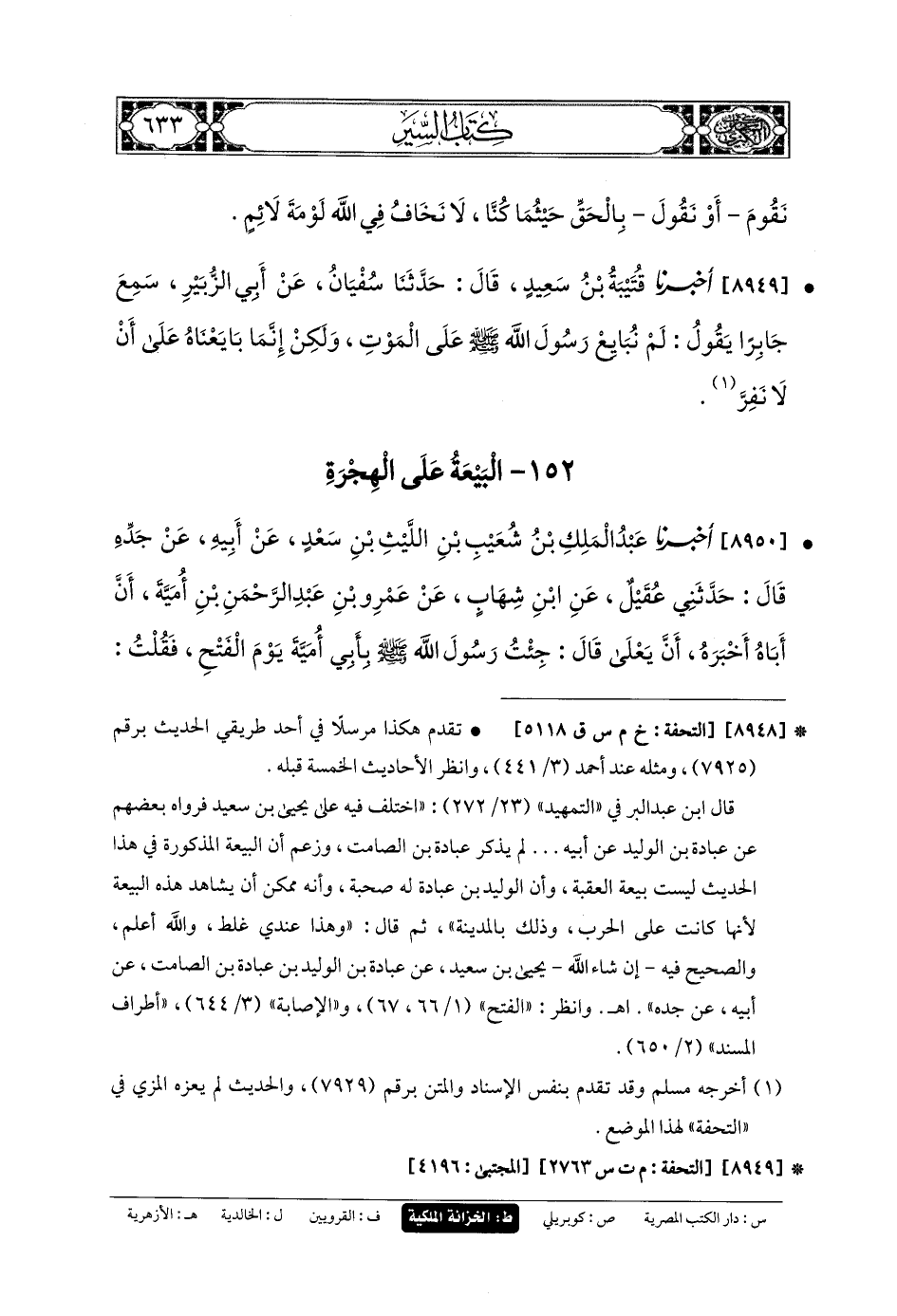 8949- أَخبَرنا قُتَيبَةُ بنُ سَعِيدٍ، قَالَ: حَدثنا سُفيانُ، عَن أَبي الزُّبَيْرِ، سَمِعَ جَابِرًا يَقُولُ: لَمْ نُبَايِعْ رَسُولَ اللهِ صَلى الله عَلَيهِ وسَلم عَلَى المَوْتِ، وَلَكِنْ إِنَّمَا بَايَعْنَاهُ عَلَى أَنْ لا نَفِرَّ.