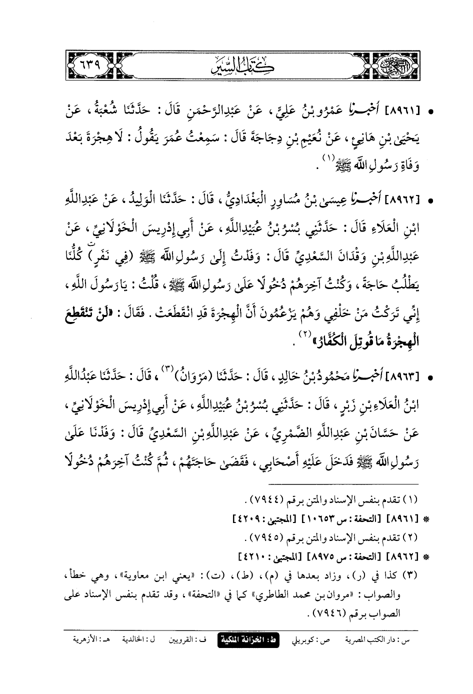 8963- أَخبَرنا مَحْمُودُ بنُ خَالِدٍ، قَالَ: حَدثنا مَرْوَانُ، قَالَ: حَدثنا عَبدُ اللهِ بنُ العَلاءِ بنِ زَبْرٍ، قَالَ: حَدَّثني بُسْرُ بنُ عُبَيدِ اللهِ، عَن أَبي إِدْرِيسَ الخَوْلانِيِّ، عَن حَسَّانَ بنِ عَبدِ اللهِ الضَّمْرِيِّ، عَن عَبدِ اللهِ بنِ السَّعْدِيِّ قَالَ: وَفَدْنَا عَلَى رَسُولِ اللهِ صَلى الله عَلَيهِ وسَلم، فَدَخَلَ عَلَيْهِ أَصْحَابِي، فَقَضَى حَاجَتَهُمْ، ثُمَّ كُنْتُ آخِرَهُمْ دُخُولاً عَلَيْهِ، فَقَالَ: حَاجَتُكَ؟ فَقُلْتُ: يَا رَسُولَ اللهِ، مَتَى تَنْقَطِعُ الهِجْرَةُ؟ قَالَ رَسُولُ اللهِ صَلى الله عَلَيهِ وسَلم: لا تَنْقَطِعُ الهِجْرَةُ مَا قُوتِلَ الكُفَّارُ.
