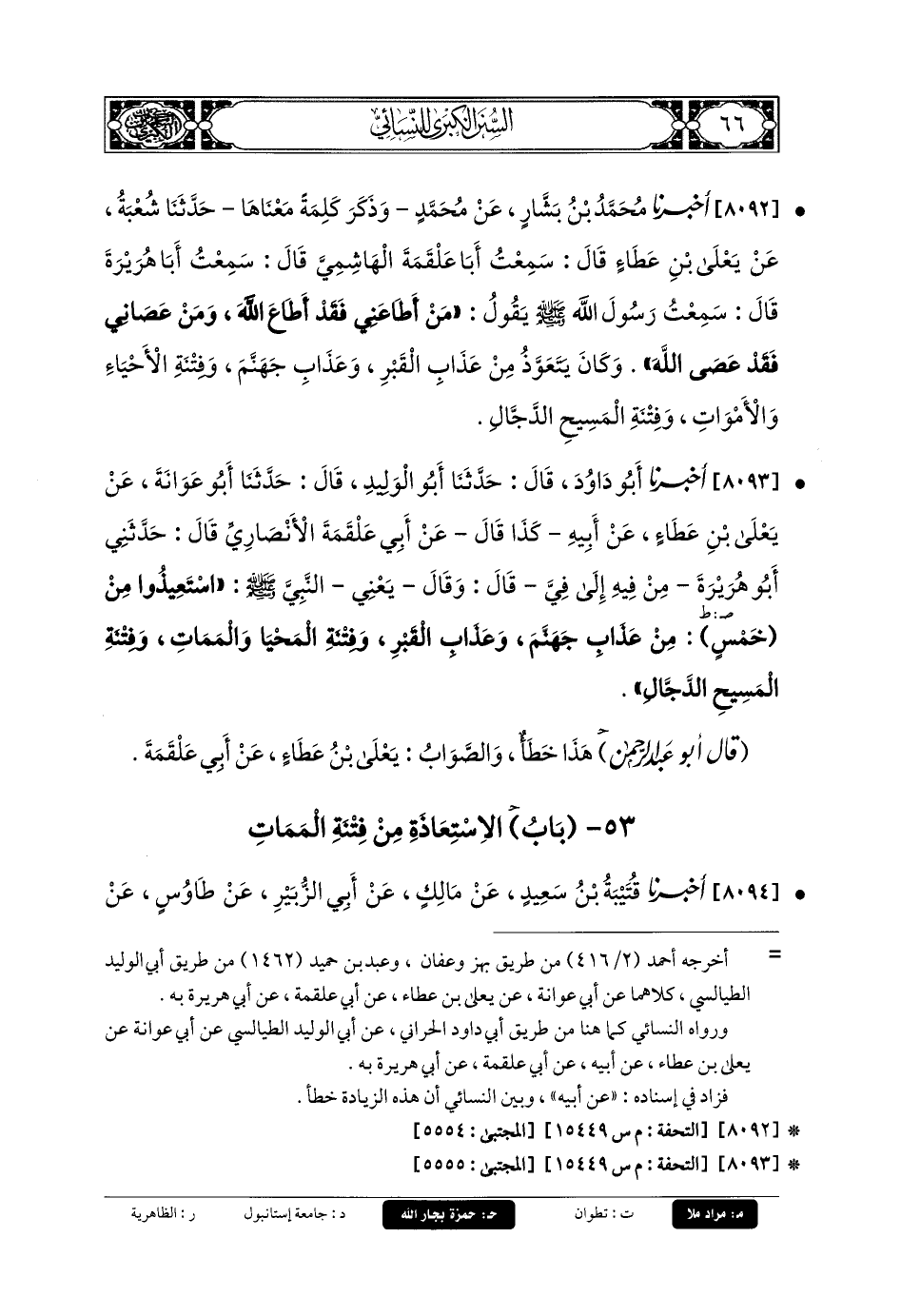 8093- أَخبَرنا أَبو دَاوُدَ، قَالَ: حَدثنا أَبو الوَلِيدِ، قَالَ: حَدثنا أَبو عَوَانَةَ، عَن يَعْلَى بنِ عَطَاءٍ، عَن أَبيهِ، كَذَا قَالَ: عَن أَبي عَلْقَمَةَ الأَنْصَارِيِّ، قَالَ: حَدَّثني أَبو هُرَيْرَةَ مِنْ فِيهِ إِلَى فِيَّ قَالَ: وَقَالَ، يَعْنِي النَّبيَّ صَلى الله عَلَيهِ وسَلم: اسْتَعِيذُوا مِنْ خَمْسٍ: مِنْ عَذَابِ جَهَنَّمَ، وَعَذَابِ القَبْرِ، وَفِتْنَةِ المَحْيَا وَالمَمَاتِ، وَفِتْنَةِ المَسِيحِ الدَّجَّالِ.