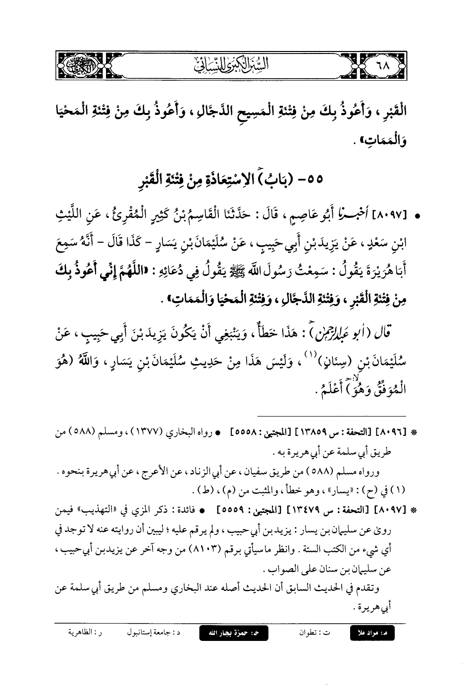 8097- أَخبَرنا أَبو عَاصِمٍ، قَالَ: حَدثنا القَاسِمُ بنُ كَثِيرٍ المُقْرِئُ، عَنِ اللَّيْثِ بنِ سَعْدٍ، عَن يَزِيدَ بنِ أَبي حَبِيبٍ، عَن سُلَيمَانَ بنِ يَسَارٍ، كَذَا قَالَ، أَنَّهُ سَمِعَ أَبَا هُرَيْرَةَ يَقُولُ: سَمِعْتُ رَسُولَ اللهِ صَلى الله عَلَيهِ وسَلم يَقُولُ فِي دُعَائِهِ: اللهُمَّ إِنِّي أَعُوذُ بِكْ مِنْ فِتْنَةِ القَبْرِ، وَفِتْنَةِ الدَّجَّالِ، وَفِتْنَةِ المَحْيَا وَالمَمَاتِ.