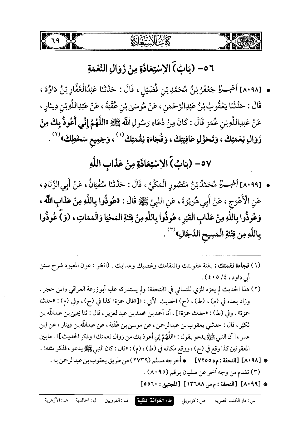8098- أَخبَرنا جَعفَرُ بنُ مُحَمدِ بنِ فُضَيْلٍ، قَالَ: حَدثنا عَبدُ الغَفَّارِ بنُ دَاوُدَ، قَالَ: حَدثنا يَعْقُوبُ بنُ عَبدِ الرَّحمَنِ، عَن مُوسَى بنِ عُقْبَةَ، عَن عَبدِ اللهِ بنِ دِينَارٍ، عَن عَبدِ اللهِ بنِ عُمَرَ، قَالَ: كَانَ مِنْ دُعَاءِ رَسُولِ اللهِ صَلى الله عَلَيهِ وسَلم: اللهُمَّ إِنِّي أَعُوذُ بِكَ مِنْ زَوَالِ نِعْمَتِكَ، وَتَحَوُّلِ عَافِيَتِكَ، وَفُجَاءَةِ نِقْمَتِكَ، وَجَمِيعِ سَخَطِكَ.