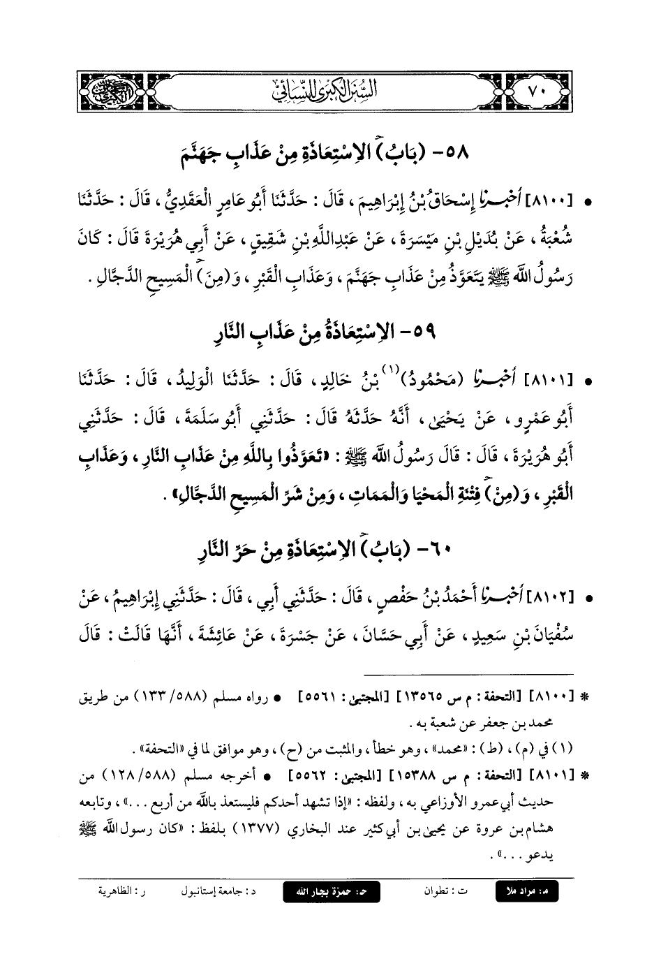 8100- أَخبَرنا إِسحَاقُ بنُ إِبْرَاهِيمَ، قَالَ: حَدثنا أَبو عَامِرٍ العَقَدِيُّ، قَالَ: حَدثنا شُعبَةُ، عَن بُدَيْلِ بنِ مَيْسَرَةَ، عَن عَبدِ اللهِ بنِ شَقِيقٍ، عَن أَبي هُرَيْرَةَ، قَالَ: كَانَ رَسُولُ اللهِ صَلى الله عَلَيهِ وسَلم يَتَعَوَّذُ مِنْ عَذَابِ جَهَنَّمَ، وَعَذَابِ القَبْرِ، وَمن المَسِيحِ الدَّجَّالِ.