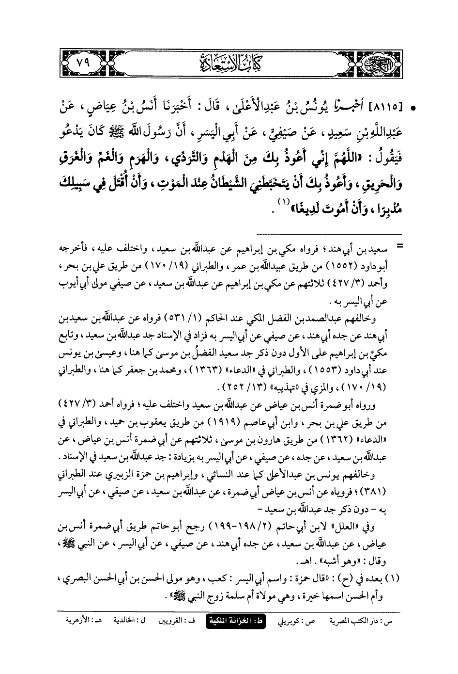 8115- أَخبَرنا يُونُسُ بنُ عَبدِ الأَعْلَى، قَالَ: أَخبَرنا أَنَسُ بنُ عِيَاضٍ، عَن عَبدِ اللهِ بنِ سَعِيدٍ، عَن صَيْفِيٍّ، عَن أَبي اليَسَرِ، أَنَّ رَسُولَ اللهِ صَلى الله عَلَيهِ وسَلم كَانَ يَدْعُو فَيَقُولُ: اللهُمَّ إِنِّي أَعُوذُ بِكَ مِنَ الهَدْمِ، وَالتَّرَدِّي، وَالهَرَمِ، وَالغَمِّ، وَالغَرِقِ وَالحَرِيقِ، وَأَعُوذُ بِكَ أَنْ يَتَخَبَّطَنِي الشَّيْطَانُ عِنْدَ المَوْتِ، وَأَنْ أُقْتَلَ فِي سَبِيلِكَ مُدْبِرًا، وَأَنْ أَمُوتَ لَدِيغًا.