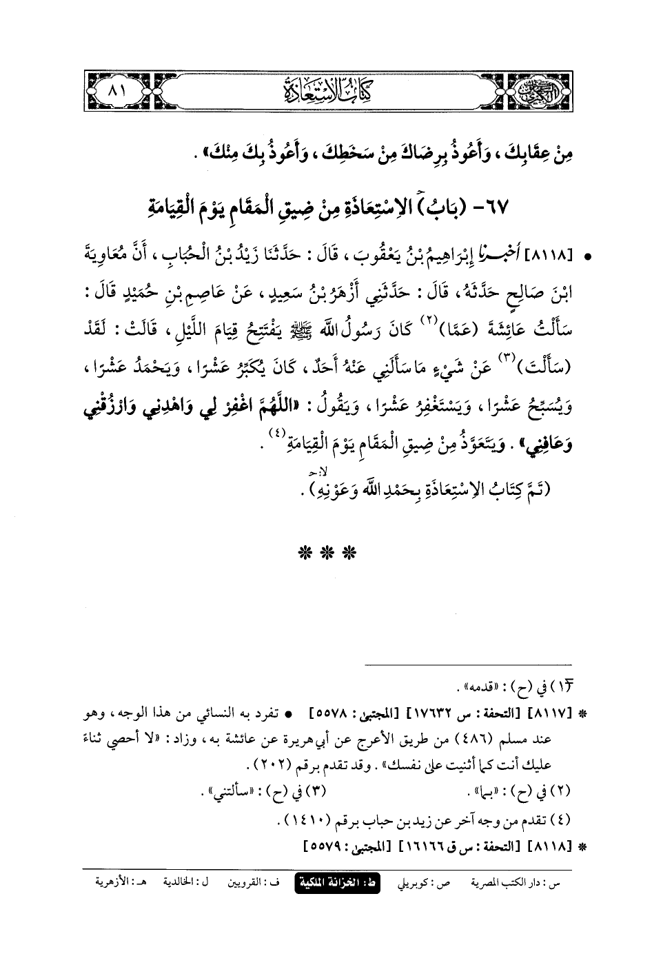 8118- أَخبَرنا إِبْرَاهِيمُ بنُ يَعْقُوبَ، قَالَ: حَدثنا زَيْدُ بنُ الحُبَابِ، أَنَّ مُعاويَةَ بْنَ صَالِحٍ حَدَّثَهُ قَالَ: حَدَّثني أَزْهَرُ بنُ سَعِيدٍ، عَن عَاصِمِ بنِ حُمَيْدٍ قَالَ: سَأَلْتُ عَائِشَةَ عَمَّا كَانَ رَسُولُ اللهِ صَلى الله عَلَيهِ وسَلم يَفْتَتِحُ قِيَامَ اللَّيْلِ؟ قَالَتْ: لَقَدْ سَأَلْتَ عَن شَيْءٍ مَا سَأَلَنِي عَنهُ أَحَدٌ، كَانَ يُكَبِّرُ عَشْرًا، وَيَحْمَدُ عَشْرًا، وَيُسَبِّحُ عَشْرًا، وَيَسْتَغْفِرُ عَشْرًا وَيَقُولُ: اللهُمَّ اغْفِرْ لِي وَاهْدِنِي وَارْزُقْنِي وَعَافِنِي وَيَتَعَوَّذُ مِنْ ضِيقِ المَقَامِ يَوْمَ القِيَامَةِ.