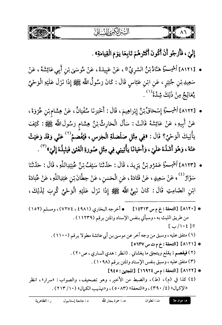 8121- أَخبَرنا هَنَّادُ بنُ السَّرِيُّ، عَن عَبِيدَةَ (1)، عَن مُوسَى بنِ أَبي عَائِشَةَ، عَن سَعِيدِ بنِ جُبَيْرٍ، عَنِ ابنِ عَبَّاسٍ قَالَ: كَانَ رَسُولُ اللهِ صَلى الله عَلَيهِ وسَلم إِذَا نَزَلَ عَلَيْهِ الوَحْيُ يُعَالِجُ مِنْ ذَلِكَ شِدَّةً.