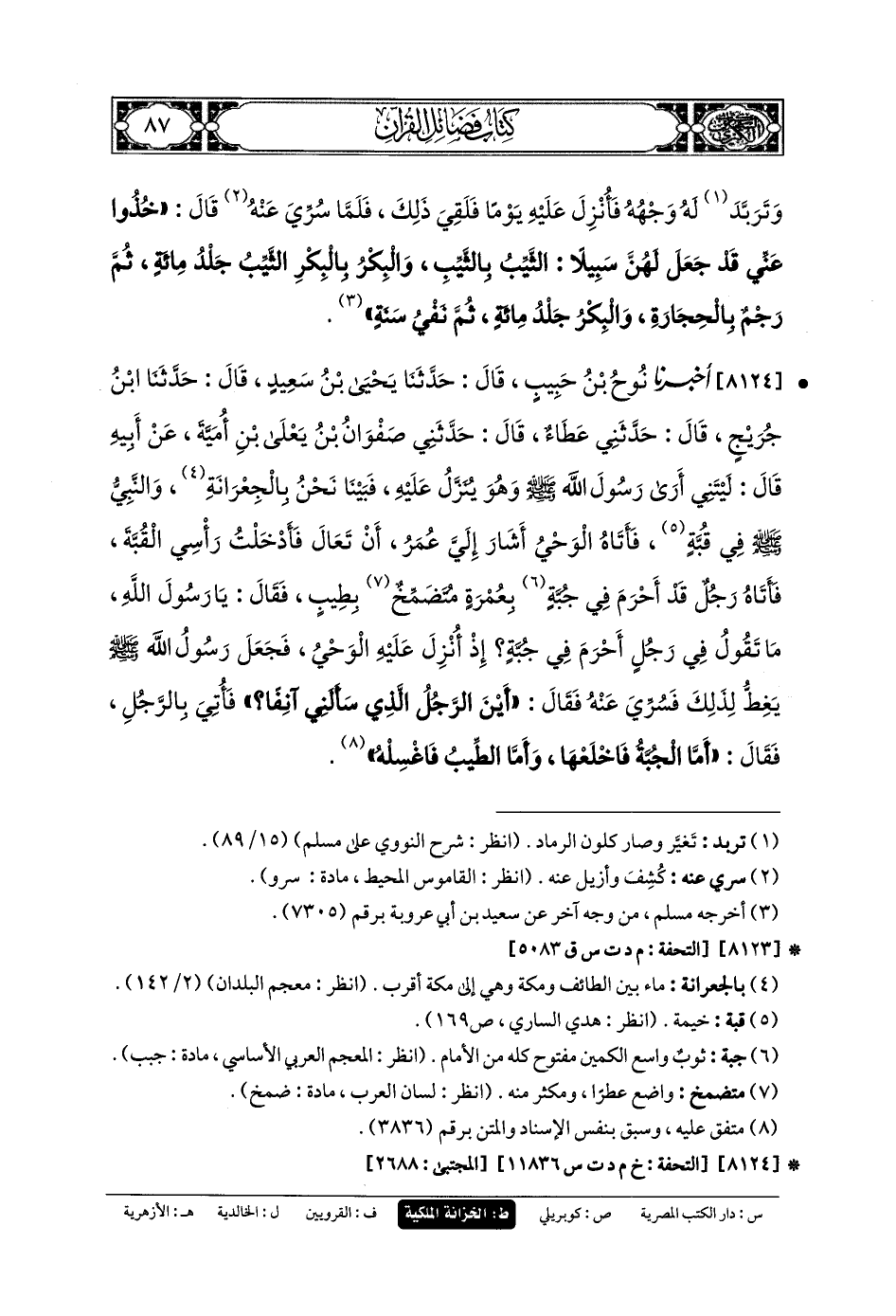 8124- أَخبَرنا نُوحُ بنُ حَبِيبٍ، قَالَ: حَدثنا يَحيَى بنُ سَعِيدٍ، قَالَ: حَدثنا ابنُ جُرَيْجٍ، قَالَ: حَدَّثني عَطَاءٌ، قَالَ: حَدَّثني صَفْوَانُ بنُ يَعْلَى بنِ أُمَيَّةَ، عَن أَبيهِ، قَالَ: لَيْتَنِي أَرَى رَسُولَ اللهِ صَلى الله عَلَيهِ وسَلم وَهُو يُنْزَلُ عَلَيْهِ، فَبَيْنَا نَحْنُ بِالجِعْرَانَةِ وَالنَّبيُّ صَلى الله عَلَيهِ وسَلم فِي قُبَّةٍ، فَأَتَاهُ الوَحْيُ، أَشَارَ إِلَيَّ عُمَرُ أَنْ تَعَالَ، فَأَدْخَلْتُ رَأْسِي القُبَّةَ، فَأَتَاهُ رَجُلٌ قَدْ أَحْرَمَ فِي جُبَّةٍ بِعُمْرَةٍ مُتَضَمِّخٌ بِطِيبٍ، فَقَالَ: يَا رَسُولِ اللهِ: مَا تَقُولُ فِي رَجُلٍ أَحْرَمَ فِي جُبَّةٍ؟ إِذْ أُنْزِلَ عَلَيْهِ الوَحْيُ، فَجَعَلَ رَسُولُ اللهِ صَلى الله عَلَيهِ وسَلم يَغِطُّ لِذَلِكَ، فَسُرِّيَ عَنهُ فَقَالَ: أَيْنَ الرَّجُلُ الَّذِي سَأَلَنِي آنِفًا؟ فَأُتِيَ بِالرَّجُلِ، فَقَالَ: أَمَّا الجُبَّةُ فَاخْلَعْهَا، وَأَمَّا الطِّيبُ فَاغْسِلْهُ.