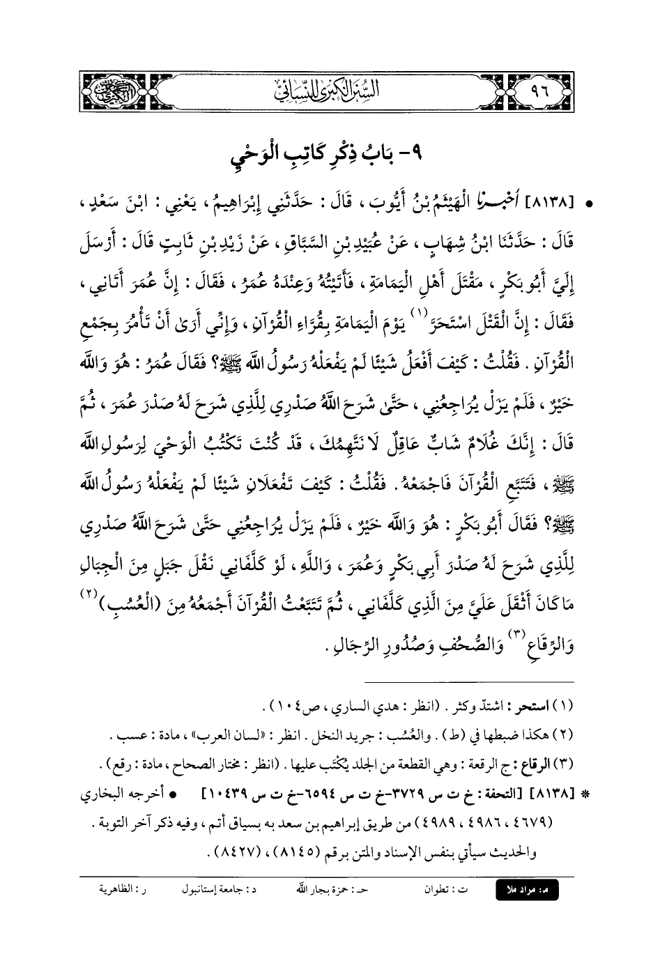 8138- أَخبَرنا الهَيْثَمُ بنُ أَيوبَ، قَالَ: حَدَّثني إِبْرَاهِيمُ، يَعْنِي ابنَ سَعْدٍ، قَالَ: حَدثنا ابنُ شِهَابٍ، عَن عُبَيدِ بنِ السَّبَّاقِ، عَن زَيْدِ بنِ ثَابِتٍ قَالَ: أَرْسَلَ إِلَيَّ أَبو بَكْرٍ مَقْتَلَ أَهْلِ اليَمَامَةِ، فَأَتَيْتُهُ وَعِنْدَهُ عُمَرُ فَقَالَ: إِنَّ عُمَرَ أَتَانِي فَقَالَ: إِنَّ القَتْلَ اسْتَحَرَّ يَوْمَ اليَمَامَةِ بِقُرَّاءِ القُرْآنِ، وَإِنِّي أَرَى أَنْ تَأْمُرَ بِجَمْعِ القُرْآنِ، فَقُلْتُ: كَيْفَ أَفْعَلُ شَيْئًا لَمْ يَفْعَلْهُ رَسُولُ اللهِ صَلى الله عَلَيهِ وسَلم؟ فَقَالَ عُمَرُ: هُوَ وَاللهِ خَيْرٌ، فَلَمْ يَزَلْ يُرَاجِعُنِي حَتَّى شَرَحَ اللهُ صَدْرِي لِلَّذِي شَرَحَ لَهُ صَدْرَ عُمَرَ، ثُمَّ قَالَ: إِنَّكَ غُلامٌ شَابٌّ عَاقِلٌ لا نَتَّهِمُكَ، قَدْ كُنْتَ تَكْتُبُ الوَحْيَ لِرَسُولِ اللهِ صَلى الله عَلَيهِ وسَلم، فَتَتَّبَعِ القُرْآنَ فَاجْمَعْهُ، فَقُلْتُ: كَيْفَ تَفْعَلانِ شَيْئًا لَمْ يَفْعَلْهُ رَسُولُ اللهِ صَلى الله عَلَيهِ وسَلم؟ فَقَالَ أَبو بَكْرٍ: هُوَ وَاللهِ خَيْرٌ، فَلَمْ يَزَلْ يُرَاجِعُنِي حَتَّى شَرَحَ اللهُ صَدْرِي لِلَّذِي شَرَحَ لَهُ صَدْرَ أَبي بَكْرٍ وَعُمَرَ، وَاللهِ لَوْ كَلَّفَانِي نَقْلَ جَبَلٍ مِنَ الجِبَالِ مَا كَانَ أَثْقَلَ عَلَيَّ مِنَ الَّذِي كَلَّفَانِي، ثُمَّ تَتَبَّعْتُ القُرْآنَ أَجْمَعُهُ مِنَ العُسُبِ، وَالرِّقَاعِ، وَالصُّحُفِ، وَصُدُورِ الرِّجَالِ.