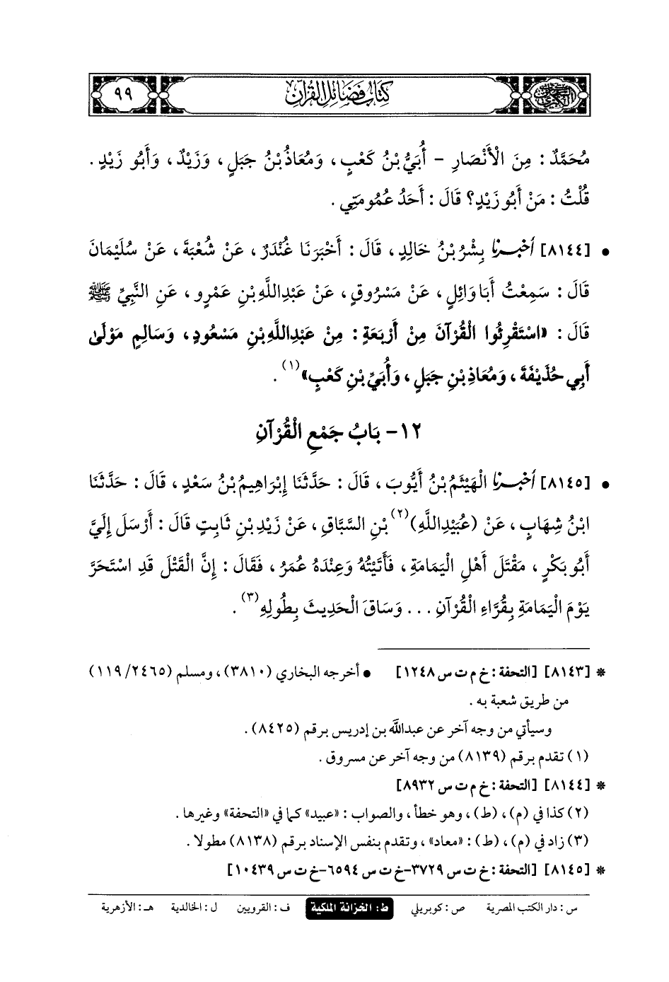 8144- أَخبَرنا بِشْرُ بنُ خَالِدٍ، قَالَ: أَخبَرنا غُنْدَرٌ، عَن شُعبَةَ، عَن سُلَيمَانَ، قَالَ: سَمِعْتُ أَبَا وَائِلٍ، عَن مَسْرُوقٍ، عَن عَبدِ اللهِ بنِ عَمْرٍو، عَنِ النَّبيِّ صَلى الله عَلَيهِ وسَلم قَالَ: اسْتَقْرِئُوا القُرْآنَ مِنْ أَرْبَعَةٍ: مِنْ عَبدِ اللهِ بنِ مَسْعُودٍ، وَسَالِمٍ مَوْلَى أَبي حُذَيْفَةَ، وَمُعَاذِ بنِ جَبَلٍ، وَأُبَيِّ بنِ كَعْبٍ.