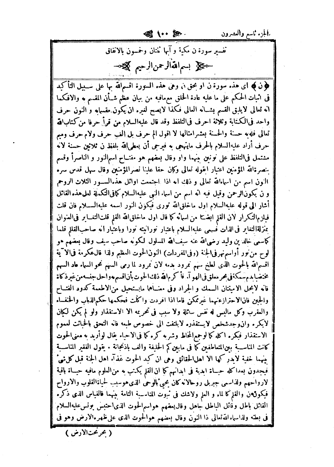 ن اى هذه سورة ن او بحق ن وهى هذه السورة اقسم الله بها على سبيل التأكيد فى اثبات الحكم على ما عليه عادة الخلق مع ما فيه من بيان عظم شأن المقسم به والا فكما انه تعالى لا يليق القسم بشانه العالي فكذا لا يصح لغيره ان يكون مقسما به والنون حرف واحد فى الكتابة وثلاثة أحرف فى التلفظ وقد قال عليه السلام من قرأ حرفا من كتاب الله تعالى فله به حسنة والحسنة بعشر أمثالها لا أقول الم حرف بل الف حرف ولام حرف وميم حرف أراد عليه السلام بالحرف ما يتهجى به فيرجى أن يعطى الله بلفظ ن ثلاثين حسنة لانه مشتمل فى التلفظ على نونين بينهما واو وقال بعضهم هو مفتاح اسم النور والناصر أو قسم بنصرة الله المؤمنين اعتبارا بقوله تعالى وكان حقا علينا نصر المؤمنين وقال سهل قدس سره النون اسم من اسماء الله تعالى وذلك انه إذا اجتمعت أوائل هذه السور الثلاث الر وحم ون يكون الرحمن وقيل فيه إنه اسم من اسماء النبي عليه السلام كما فى التكملة لعل هذه القائل أشار الى قوله عليه السلام أول ما خلق الله نورى فيكون النور اسمه عليه السلام فان قلت فيلزم التكرار لان القلم أيضا من أسمائه كما قال أول ما خلق الله القلم قلت التغاير فى العنوان بمنزلة التغاير فى الذات فسمى عليه السلام باعتبار نورانيته نورا وباعتبار انه صاحب القلم قلما كما سمى خالدين وليد رضى الله عنه سيف الله المسلول لكونه صاحب سيف وقال بعضهم هو لوح من نور أو اسم نهر فى الجنة (وفى المفردات) النون الحوت العظيم ولذا قال عكرمة فى الآية اقسم الله بالحوت الذي لطخ سهم نمرود بدمه لان نمرود لما رمى السهم نحو السماء عاد السهم مختضبا بدم سمكة فى بحر معلق فى الهولء فأكرم الله ذلك الحوت بأن اقسم به وأحل جنسه من غير ذكاة فانه لا يحل الا ميتتان السمك والجراد وفى معناهما ما يستحيل من الاطعمة كدود الفتاح والجبن فان الاحتراز عنهما غير ممكن فاما إذا أفردت وأكلت فحكمها حكم الذباب والخنفساء والعقرب وكل ما ليس له نفس سائلة ولا سبب فى تحريمه الا الاستقذار ولو لم يكن لكان لا يكرء وان وجد شخص لا يستقذره لا يلتفت الى خصوص طبعه فانه التحق بالخبائث لعموم الاستقذار فيكره أكله كما لو جمع المخاط وشربه كره كما فى الاحياء يقال لو أريد به معنى الحوت كانت المناسبة بين المتعاطفين كما فى ما بين كم الخليفة والف باذنجانة. يقول الفقير المناسبة بينهما خفية لا يدركها الا اهل الحقائق وهى ان كبد الحوت غذآء اهل الجنة قبل كل شىء فيجدون بعد أكله حياة ابدية فى أبدانهم كما ان القلم يكتب به من العلوم ما فيه حياة باقية لارواحهم ولذا سمى جبريل روحا لانه كان يجيئ بالوحى الذي هو سبب لحياة القلوب والأرواح فيكون ن والقلم كالماء والعلم ولا شك فى ثبوت المناسبة التامة بينهما فالقياس الذي ذكره القائل باطل وقائل الباطل جاهل وقال بعضهم هو اسم الحوت الذي احتبس يونس عليه السلام فى بطنه ولذا سماء الله تعالى ذا النون وقال بعضهم هو الحوت الذي على ظهره الأرض وهو فى