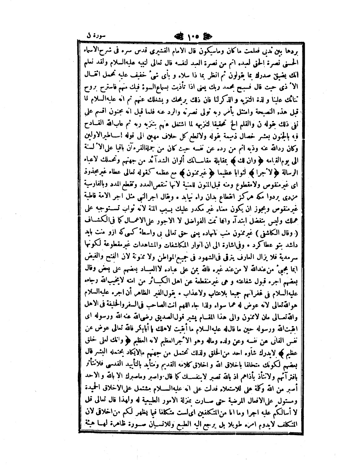 بردها بين ثديى فعلمت ما كان وما سيكون قال الامام القشيري قدس سره فى شرح الأسماء الحسنى نصرة الحق لعبده أتم من نصرة العبد لنفسه قال تعالى لنبيه عليه السلام ولقد نعلم انك يضيق صدرك بما يقولون ثم انظر بماذا سلاه وبأى شىء خفيف عليه تحمل أثقال الأذى حيث قال فسبح بحمد ربك يعنى إذا تأذيت بسماع السوء فيك منهم فاسترح بروح تنائك علينا ولذة التنزيه والذكر لنا فان ذلك يريحك ويشغلك عنهم ثم انه عليه السلام لما قبل هذه النصيحة وامتثل بأمر ربه تولى نصرته والرد عنه فلما قيل انه مجنون اقسم على نفى ذلك بقوله ن والقلم إلخ تحقيقا لتنزيهه لما اشتغل عنهم بتنزيه ربه ثم عاب الله القادح فيه بالجنون بعشر خصال ذميمة بقوله ولا تطع كل حلاف مهين الى قوله أساطير الأولين وكان رد الله عنه وذبه أتم من رده عن نفسه حيث كان من جملة القرآن باقيا على الألسنة الى يوم القيامة وَإِنَّ لَكَ بمقابلة مقاساتك ألوان الشدائد من جهتهم وتحملك لاعباء الرسالة لَأَجْراً لثوابا عظيما غَيْرَ مَمْنُونٍ مع عظمه كقوله تعالى عطاء غير مجذوذ اى غير منقوص ولا مقطوع ومنه قيل المنون للمنية لانها تنقص العدد وتقطع المدد وبالفارسية مزدى بردوا مكه هركز انقطاع بدان راه نيابد. ويقال اجر النبي مثل اجر الامة قاطبة غير منقوص ويجوز ان يكون معناه غير مكدر عليك بسبب المنة لانه ثواب تستوجبه على عملك وليس بتفضل ابتداء وانما تمت الفواضل لا الأجور على الأعمال كما فى الكشاف (وقال الكاشفى) غير ممنون منب نانهاده يعنى حق تعالى بي واسطه كسى كه ازو منت بايد داشد بتو عطا كرد. وفى اشارة الى ان أنوار المكاشفات والمشاهدات غير مقطوعة لكونها سرمدية فلا يزال العارف يترقى فى الشهود فى جميع المواطن ولا ممنونة لان الفتح والفيض انما يجيئ من عند الله لا من عند غيره فالله يمن على عباده لا العباد بعضهم على بعض وقال بعضهم اجره قبول شفاعته وهى غيره منقطعة عن اهل الكبائر من أمته لا يخيب الله رجاءه عليه السلام فى غفرانهم جميعا بلا عتاب ولا عذاب. يقول الفقير الظاهر أن اجره عليه السلام هو الله تعالى لانه عوض له عما سواه ولذا جاء اللهم أنت الصاحب فى السفر والخليفة فى الأهل والله تعالى مان لا ممنون والى هذا المقام يشير قول الصديق رضى الله عنه الله ورسوله اى أبقيت الله ورسوله حين ما قال له عليه السلام ما أبقيت لاهلك يا أبا بكر فالله تعالى عوض عن نفس الفاني عن نفسه وعن ولده وماله وهو الأجر العظيم لانه العظيم وَإِنَّكَ لَعَلى خُلُقٍ عَظِيمٍ لا يدرك شآوه أحد من الخلق ولذلك تحتمل من جهتهم ما لا يكاد يحتمله البشر قال بعضهم لكونك متخلقا بأخلاق الله واخلاق كلامه القديم ومتأيد بالتأييد القدسي فلا تتأثر بافترائهم ولا تتأذ بأذاهم إذ بالله تصبر لا بنفسك كما قال واصبر وما صبرك الا بالله والأحد أصبر من الله وكلمة على للاستعلاء فدلت على انه عليه السلام مشتمل على الأخلاق الحميدة ومستول على الافعال المرضية حتى صارت بمنزلة الأمور الطبيعية له ولهذا قال تعالى قل لا أسالكم عليه اجرا وما انا من المتكلفين اى لست متكلفا فيما يظهر لكم من اخلاقى لان المتكلف لا يدوم امره طويلا بل يرجع اليه الطبع وللانسان صورة ظاهرة لها هيئة