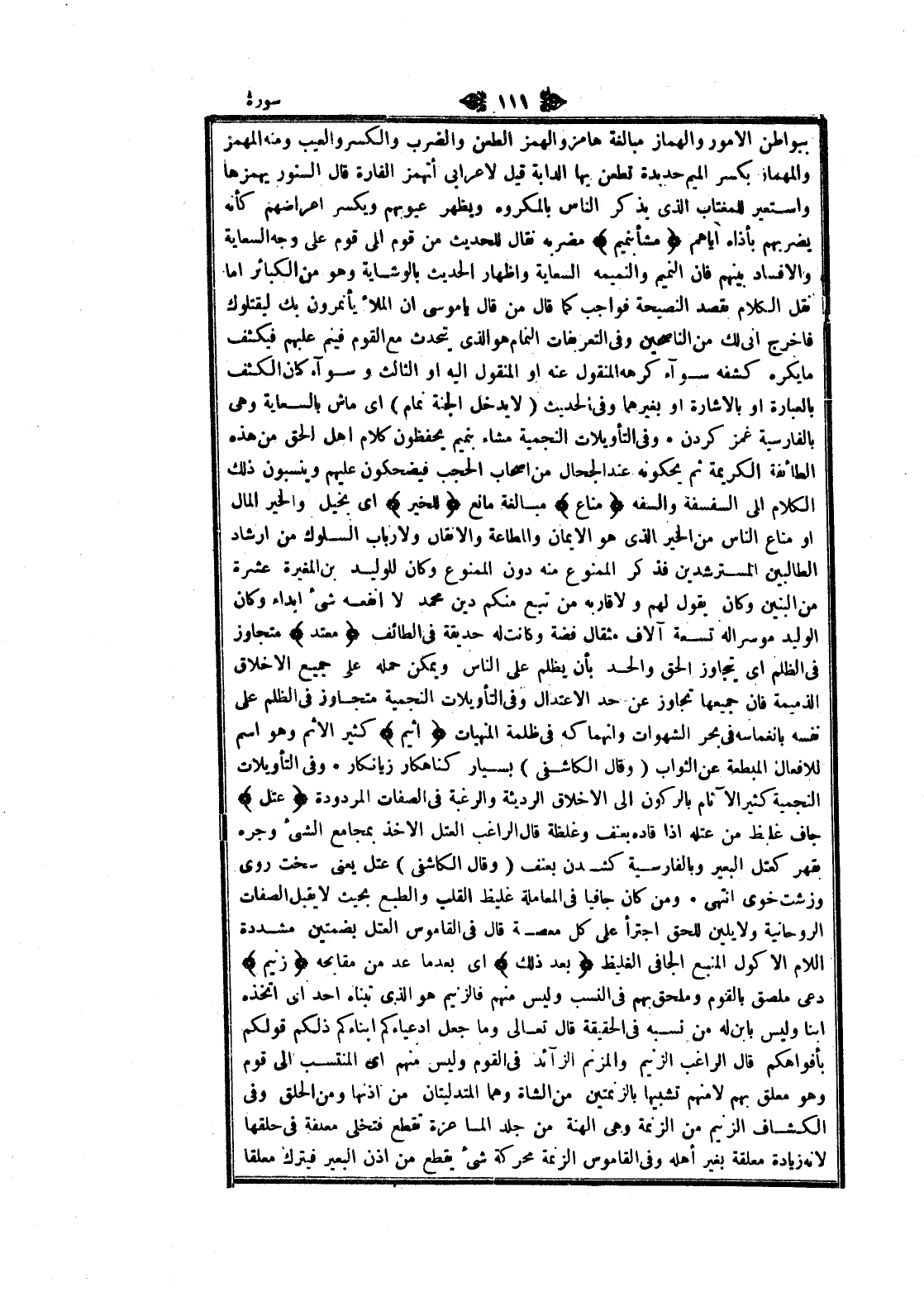 ببواطن الأمور والهماز مبالغة هامز والهمز الطعن والضرب والكسر والعيب ومنه المهمز والمهماز بكسر الميم حديدة تطعن بها الدابة قيل لاعرابى أتهمز الفارة قال السنور يهمزها واستعير للمغتاب الذي يذكر الناس بالمكروه ويظهر عيوبهم ويكسر اعراضهم كأنه يضربهم بأذاه إياهم مَشَّاءٍ بِنَمِيمٍ مضر به نقال للحديث من قوم الى قوم على وجه السعاية والإفساد بينهم فان النميم والنميمة السعاية واظهار الحديث بالوشاية وهو من الكبائر اما نقل الكلام بقصد النصيحة فواجب كما قال من قال يا موسى ان الملأ يأتمرون بك ليقتلوك فاخرج انى لك من الناصحين وفى التعريفات النمام هو الذي يتحدث مع القوم فينم عليهم فيكشف ما يكره كشفه سوآء كرهه المنقول عنه او المنقول اليه او الثالث وسوآء كان الكشف بالعبارة او بالاشارة او بغيرهما وفى الحديث (لا يدخل الجنة تمام) اى ماش بالسعاية وهى بالفارسية غمز كردن. وفى التأويلات النجمية مشاء بنميم يحفظون كلام اهل الحق من هذه الطائفة الكريمة ثم يحكونه عند الجحال من اصحاب الحجب فيضحكون عليهم وينسبون ذلك الكلام الى السفسفة والسفه مَنَّاعٍ مبالغة مانع لِلْخَيْرِ اى بخيل والخير المال او مناع الناس من الخير الذي هو الايمان والطاعة والإتقان ولارباب السلوك من ارشاد الطالبين المسترشدين فذكر الممنوع منه دون الممنوع وكان للوليد بن المغيرة عشرة من البنين وكان يقول لهم ولاقاربه من تبع منكم دين محمد لا أنفعه شىء إبداء وكان الوليد موسرا له تسعة آلاف مثقال فضة وكانت له حديقة فى الطائف مُعْتَدٍ متجاوز فى الظلم اى يتجاوز الحق والحد بأن يظلم على الناس ويمكن حمله على جميع الأخلاق الذميمة فان جميعها تجاوز عن حد الاعتدال وفى التأويلات النجمية متجاوز فى الظلم على نفسه بانغماسه فى بحر الشهوات وانهماكه فى ظلمة المنهيات أَثِيمٍ كثير الإثم وهو اسم للافعال المبطعة عن الثواب (وقال الكاشفى) بسيار كناهكار زيانكار. وفى التأويلات النجمية كثير الآثام بالركون الى الأخلاق الرديئة والرغبة فى الصفات المردودة عُتُلٍّ جاف غليظ من عتله إذا قاده بعنف وغلظة قال الراغب العتل الاخذ بمجامع الشيء وجره بقهر كعتل البعير وبالفارسية كشدن بعنف (وقال الكاشفى) عتل يعنى سخت روى وزشت خوى انتهى. ومن كان جافيا فى المعاملة غليظ القلب والطبع بحيث لا يقبل الصفات الروحانية ولا يلين للحق اجترأ على كل معصة قال فى القاموس العتل بضمتين مشددة اللام الا كول المنبع الجافي الغليظ بَعْدَ ذلِكَ اى بعد ما عد من مقابحه زَنِيمٍ دعى ملصق بالقوم وملحق بهم فى النسب وليس منهم فالزنيم هو الذي تبناه أحد اى اتخذه ابنا وليس بابن له من نسبه فى الحقيقة قال تعالى وما جعل أدعياءكم ابناءكم ذلكم قولكم بأفواهكم قال الراغب الزنيم والمزنم الزائد فى القوم وليس منهم اى المنتسب الى قوم وهو معلق بهم لا منهم تشبيها بالزنمتين من الشاة وهما المتدليتان من اذنها ومن الحلق وفى الكشاف الزنيم من الزنمة وهى الهنة من جلد الماعزة تقطع فتخلى معلقة فى حلقها لانه زيادة معلقة بغير أهله وفى القاموس الزنمة محركة شىء يقطع من اذن البعير فيترك معلقا