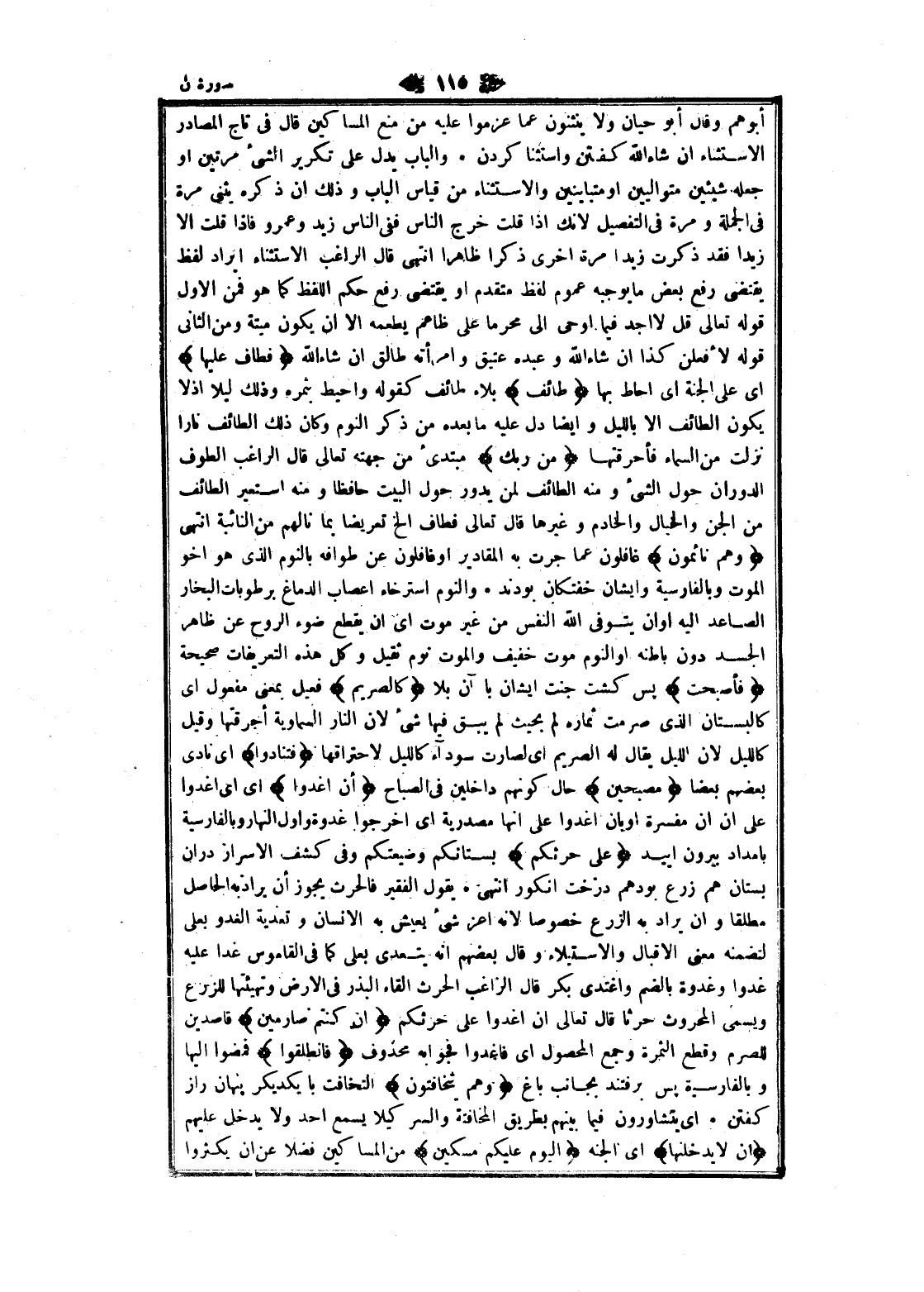 أبوهم وقال أبو حيان ولا ينثنون عما عزموا عليه من منع المساكين قال فى تاج المصادر الاستثناء ان شاء الله كفتن واستثنا كردن. والباب يدل على تكرير الشيء مرتين او جعله شيئين متواليين او متباينين والاستثناء من قياس الباب وذلك ان ذكره يثنى مرة فى الجملة ومرة فى التفصيل لانك إذا قلت خرج الناس ففى الناس زيد وعمرو فاذا قلت الا زيدا فقد ذكرت زيدا مرة اخرى ذكرا ظاهرا انتهى قال الراغب الاستثناء إيراد لفظ يقتضى رفع بعض ما يوجبه عموم لفظ متقدم او يقتضى رفع حكم اللفظ كما هو فمن الاول قوله تعالى قل لا أجد فيما اوحى الى محرما على ظاعم يطعمه الا ان يكون ميتة ومن الثاني قوله لأفعلن كذا ان شاء الله وعبده عتيق وامرأته طالق ان شاء الله فَطافَ عَلَيْها اى على الجنة اى أحاط بها طائِفٌ بلاء طائف كقوله واحيط بثمره وذلك ليلا إذ لا يكون الطائف الا بالليل وايضا دل عليه ما بعده من ذكر النوم وكان ذلك الطائف نارا نزلت من السماء فأحرقتها مِنْ رَبِّكَ مبتدئ من جهته تعالى قال الراغب الطواف الدوران حول الشيء ومنه الطائف لمن يدور حول البيت حافظا ومنه استعير الطائف من الجن والخيال والخادم وغيرها قال تعالى فطاف إلخ تعريضا بما نالهم من النائبة انتهى وَهُمْ نائِمُونَ غافلون عما جرت به المقادير او غافلون عن طوافه بالنوم الذي هو أخو الموت وبالفارسية وايشان خفتكان بودند. والنوم استرخاء اعصاب الدماغ برطوبات البخار الصاعد اليه أو أن يتوفى الله النفس من غير موت اى ان يقطع ضوء الروح عن ظاهر الجسد دون باطنه او النوم موت خفيف والموت نوم ثقيل وكل هذه التعريفات صحيحة فَأَصْبَحَتْ پس كشت جنت ايشان با آن بلا كَالصَّرِيمِ فعيل بمعنى مفعول اى كالبستان الذي صرمت ثماره لم بحيث لم يبق فيها شىء لان النار السماوية أحرقتها وقيل كالليل لان الليل يقال له الصريم اى لصارت سوداء كالليل لاحتراقها فَتَنادَوْا اى نادى بعضهم بعضا مُصْبِحِينَ حال كونهم داخلين فى الصباح أَنِ اغْدُوا اى اى اغدوا على ان ان مفسرة او بان اغدوا على انها مصدرية اى اخرجوا غدوة وأول النهار وبالفارسية بامداد بيرون آييد عَلى حَرْثِكُمْ بستانكم وضيعتكم وفى كشف الاسرار دران بستان هم زرع بود هم درخت انگور انتهى. يقول الفقير فالحرث يجوز أن يراد به الحاصل مطلقا وان يراد به الزرع خصوصا لانه أعز شىء يعيش به الإنسان وتعدية الغدو بعلى لتضمنه معنى الإقبال والاستيلاء وقال بعضهم انه يتعدى بعلى كما فى القاموس غدا عليه غدوا وغدوة بالضم واغتدى بكر قال الراغب الحرث إلقاء البذر فى الأرض وتهيئتها للزرع ويسمى المحروث حرثا قال تعالى ان اغدوا على حرثكم إِنْ كُنْتُمْ صارِمِينَ قاصدين للصرم وقطع الثمرة وجمع المحصول اى فاغدوا فجوابه محذوف فَانْطَلَقُوا فمضوا إليها وبالفارسية پس برفتند بجانب باغ وَهُمْ يَتَخافَتُونَ التخافت با يكديكر پنهان راز كفتن. اى يتشاورون فيما بينهم بطريق المخافتة والسر كيلا يسمع أحد ولا يدخل عليهم أَنْ لا يَدْخُلَنَّهَا اى الجنة الْيَوْمَ عَلَيْكُمْ مِسْكِينٌ من المساكين فضلا عن ان يكثروا