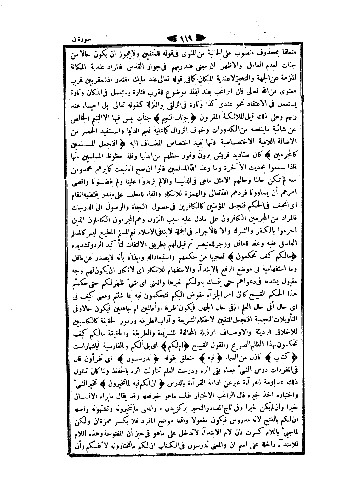 متعلقا بمحذوف منصوب على الحالية من المنوي فى قوله للمتقين ولا يجوز ان يكون حالا من جنات لعدم العامل والأظهر ان معنى عند ربهم فى جوار القدس فالمراد عندية المكانة المنزهة عن الجهة والتحيز لا عندية المكان كما فى قوله تعالى عند مليك مقتدر إذ للمقربين قرب معنوى من الله تعالى قال الراغب عند لفظ موضوع للقرب فتارة يستعمل فى المكان وتارة يستعمل فى الاعتقاد نحو عندى كذا وتارة فى الزلقى والمنزلة كقوله تعالى بل احياء عند ربهم وعلى ذلك قيل الملائكة المقربون جَنَّاتِ النَّعِيمِ جنات ليس فيها الا التنعم الخالص عن شائبة ما ينغصه من الكدورات وخوف الزوال كما عليه نعيم الدنيا واستفيد الحصر من الاضافة اللامية الاختصاصية فانها تفيد اختصاص المضاف اليه أَفَنَجْعَلُ الْمُسْلِمِينَ كَالْمُجْرِمِينَ كان صناديد قريش يرون وفور حظهم من الدنيا وقلة حظوظ المسلمين منها فاذا سمعوا بحديث الآخرة وما وعد الله المسلمين قالوا ان صح انا نبعث كما يرعم محمد ومن معه لم تكن حالنا وحالهم الأمثل ما هى فى الدنيا والألم يزيدوا علينا ولم يفضلونا وأقصى أمرهم أن يساوونا فردهم الله تعالى والهمزة للانكار والفاء للعطف على مقدر يقتضيه المقام اى أنحيف فى الحكم فنجعل المؤمنين كالكافرين فى حصول النجاة والوصول الى الدرجات فالمراد من المجرمين الكافرون على ما دل عليه سبب النزول وهم المجرمون الكاملون الذين أجرموا بالكفر والشرك والا فالاجرام فى الجملة لا ينافى الإسلام نعم المسلم المطيع ليس كالمسلم الفاسق ففيه وعظ للعاقل وزجر للمتبصر ثم قيل لهم بطريق الالتفات لتأكيد الرد وتشديده ما لَكُمْ كَيْفَ تَحْكُمُونَ تعجيبا من حكمهم واستبعاد اله وإيذانا بأنه لا يصدر عن عاقل وما استفهامية فى موضع الرفع بالابتداء والاستفهام للانكار اى لانكار ان يكون لهم وجه مقبول يعتدبه فى دعواهم حتى يتمسك به ولكم خبرها والمعنى اى شىء ظهر لكم حتى حكمتم هذا الحكم القبيح كأن امر الجزاء مفوض إليكم فتحكمون فيه بما شئتم ومعنى كيف فى اى حال أفي حال العلم أم فى حال الجهل فيكون ظرفا او أعالمين أم جاهلين فيكون حالا وفى التأويلات النجمية أفنجعل المتقين لاحكام الشريعة وآداب الطريقة ورموز الحقيقة كالكاسبين للاخلاق الرديئة والأوصاف الرذيلة المخالفة للشريعة والطريقة والحقيقة ما لكم كيف تحكمون بهذا الظلم الصريح والقول القبيح أَمْ لَكُمْ اى بل ألكم وبالفارسية آيا شما راست كِتابٌ نازل من السماء فِيهِ متعلق بقوله تَدْرُسُونَ اى تقرءون قال فى المفردات درس الشيء معناه بقي اثره ودرست العلم تناولت اثره بالحفظ ولما كان تناول ذلك بمداومة القراءة عبر عن ادامة القراءة بالدرس إِنَّ لَكُمْ فِيهِ لَما تَخَيَّرُونَ تخير الشيء واختياره أخذ خيره قال الراغب الاختيار طلب ما هو خير فعله وقد يقال ما يراه الإنسان خيرا وان لم يكن خيرا وفى تاج المصادر التخير بركزيدن. والمعنى ما تتخيرونه وتشتهونه وأصله ان لكم بالفتح لانه مدروس فيكون مفعولا واقعا موضع المفرد فلا يكسر همزة ان ولكن لما جيئ باللام كسرت فان لام الابتداء لا تدخل على ما هو فى حيز أن المفتوحة وهذه اللام للابتدآء داخلة على اسم ان والمعنى تدرسون فى الكتاب ان لكم ما تختارونه لأنفسكم وأن