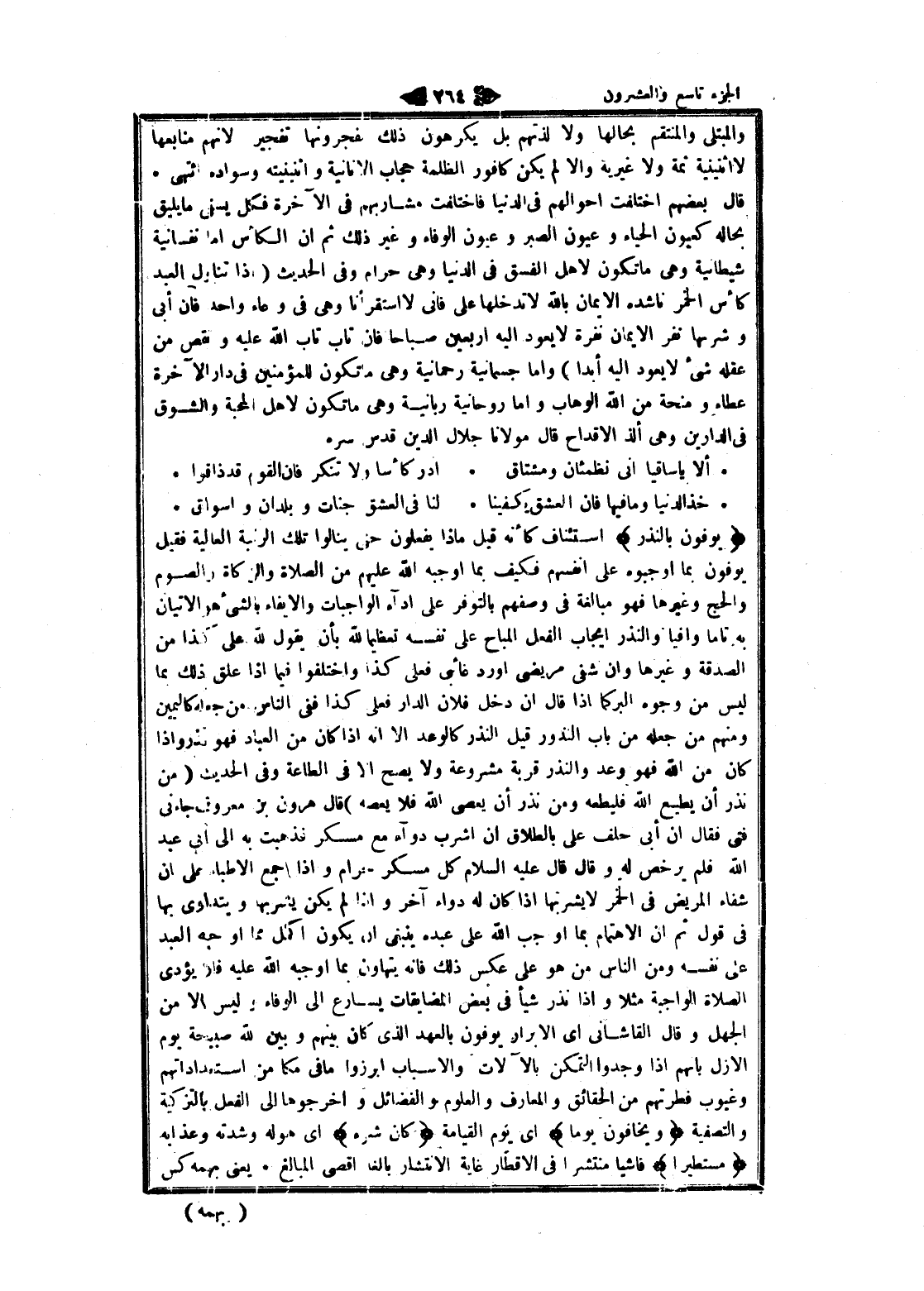 قال بعضهم اختلفت أحوالهم فى الدنيا فاختلفت مشاربهم فى الآخرة فكل يسفى ما يليق بحاله كعيون الحياء وعيون الصبر وعيون الوفاء وغير ذلك ثم ان الكأس اما نفسانية شيطانية وهى ما تكون لاهل الفسق فى الدنيا وهى حرام وفى الحديث (إذا تناول العبد كأس الخمر ناشده الايمان بالله لا تدخلها على فانى لا أستقر أنا وهى فى وعاء واحد فان أبى وشربها نفر الايمان نفرة لا يعود اليه أربعين صباحا فان تاب تاب الله عليه ونقص من عقله شىء لا يعود اليه أبدا) واما جسمانية رحمانية وهى ما تكون للمؤمنين فى دار الآخرة عطاء ومنحة من الله الوهاب واما روحانية ربانية وهى ما تكون لاهل المحبة والشوق فى الدارين وهى ألذ الأقداح قال مولانا جلال الدين قدس سره.