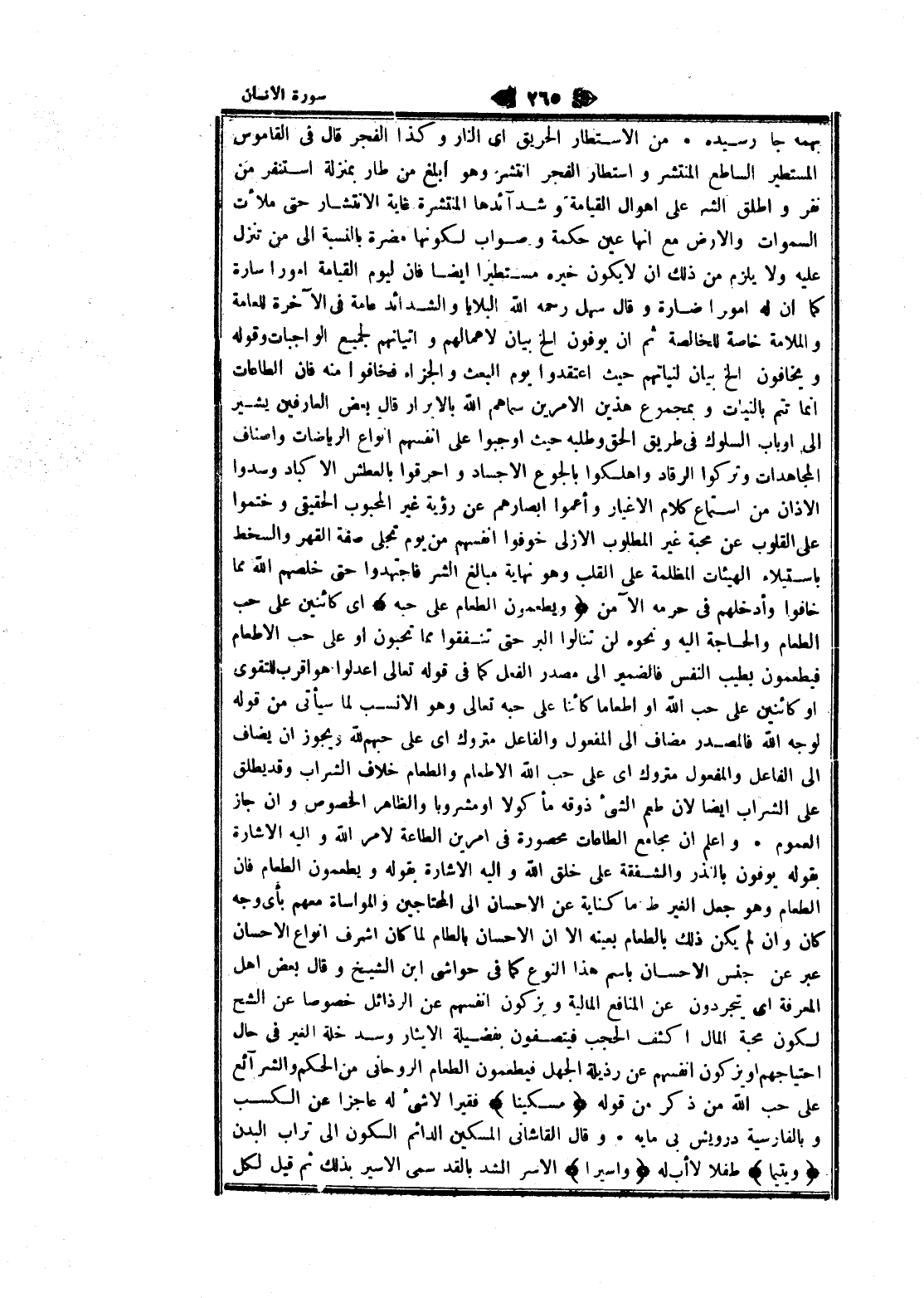 بهمه جا رسيده. من الاستطار الحريق اى النار وكذا الفجر قال فى القاموس المستطير الساطع المنتشر واستطار الفجر انتشر وهو ابلغ من طار بمنزلة استنفر من نفر واطلق الشر على اهوال القيامة وشدائدها المنتشرة غاية الانتشار حتى ملأت السموات والأرض مع انها عين حكمة وصواب لكونها مضرة بالنسبة الى من تنزل عليه ولا يلزم من ذلك ان لا يكون خيره مستطيرا ايضا فان ليوم القيامة أمورا سارة كما ان له أمورا ضارة وقال سهل رحمه الله البلايا والشدائد عامة فى الآخرة للعامة والملامة خاصة للخالصة ثم ان يوفون إلخ بيان لاعمالهم وإتيانهم لجميع الواجبات وقوله ويخافون إلخ بيان لنياتهم حيث اعتقدوا يوم البعث والجزاء فخافوا منه فان الطاعات انما تتم بالنيات وبمجموع هذين الامرين سماهم الله بالابرار قال بعض العارفين يشير الى ارباب السلوك فى طريق الحق وطلبه حيث أوجبوا على أنفسهم انواع الرياضات واصناف المجاهدات وتركوا الرقاد واهلكوا بالجوع الأجساد واحرقوا بالعطش الأكباد وسدوا الاذان من استماع كلام الأغيار وأعموا أبصارهم عن رؤية غير المحبوب الحقيقي وختموا على القلوب عن محبة غير المطلوب الأزلي خوفوا أنفسهم من يوم تجلى صفة القهر والسخط باستيلاء الهيئات المظلمة على القلب وهو نهاية مبالغ الشر فاجتهدوا حتى خلصهم الله مما خافوا وأدخلهم فى حرمه الآمن وَيُطْعِمُونَ الطَّعامَ عَلى حُبِّهِ اى كائنين على حب الطعام والحاجة اليه ونحوه لن تنالوا البر حتى تنفقوا مما تحبون او على حب الإطعام فيطعمون بطيب النفس فالضمير الى مصدر الفعل كما فى قوله تعالى اعدلوا هو اقرب للتقوى او كائنين على حب الله او اطعاما كائنا على حبه تعالى وهو الأنسب لما سيأتى من قوله لوجه الله فالمصدر مضاف الى المفعول والفاعل متروك اى على حبهم لله ويجوز ان يضاف الى الفاعل والمفعول متروك اى على حب الله الإطعام والطعام خلاف الشراب وقد يطلق على الشراب ايضا لان طعم الشيء ذوقه مأكولا او مشروبا والظاهر الخصوص وان جاز العموم. واعلم ان مجامع الطاعات محصورة فى أمرين الطاعة لامر الله واليه الاشارة بقوله يوفون بالنذر والشفقة على خلق الله واليه الاشارة بقوله ويطعمون الطعام فان الطعام وهو جعل الغير طعاما كناية عن الإحسان الى المحتاجين والمواساة معهم بأى وجه كان وان لم يكن ذلك بالطعام بعينه الا ان الإحسان بالطعام لما كان اشرف انواع الإحسان عبر عن جنس الإحسان باسم هذا النوع كما فى حواشى ابن الشيخ وقال بعض اهل المعرفة اى يتجردون عن المنافع المالية ويزكون أنفسهم عن الرذائل خصوصا عن الشح لكون محبة المال أكثف الحجب فيتصفون بفضيلة الإيثار وسد خلة الغير فى حال احتياجهم او يزكون أنفسهم عن رذيلة الجهل فيطعمون الطعام الروحاني من الحكم والشرائع على حب الله من ذكر من قوله مِسْكِيناً فقيرا لا شىء له عاجزا عن الكسب وبالفارسية درويش بي مايه. وقال القاشاني المسكين الدائم السكون الى تراب البدن وَيَتِيماً طفلا لا أب له وَأَسِيراً الاسر الشد بالقد سمى الأسير بذلك ثم قيل لكل