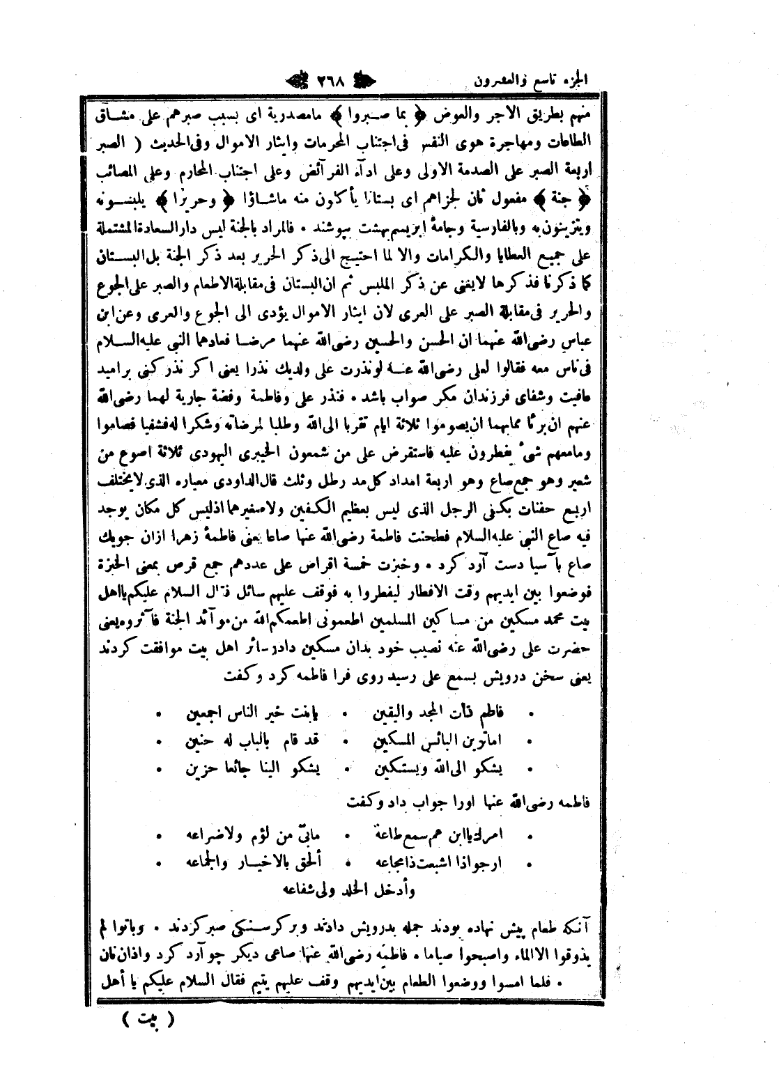 وأدخل الخلد ولى شفاعه آنكه طعام پيش نهاده بودند جمله بدرويش دادند وبر كرسنكى صبر كردند. وبا توا لم يذوقوا الا الماء وأصبحوا صياما. فاطمه رضى الله عنها صاعى ديگر چوآرد كرد وأذان نان. فلما امسوا ووضعوا الطعام بين أيديهم وقف عليهم يتيم فقال السلام عليكم يا أهل