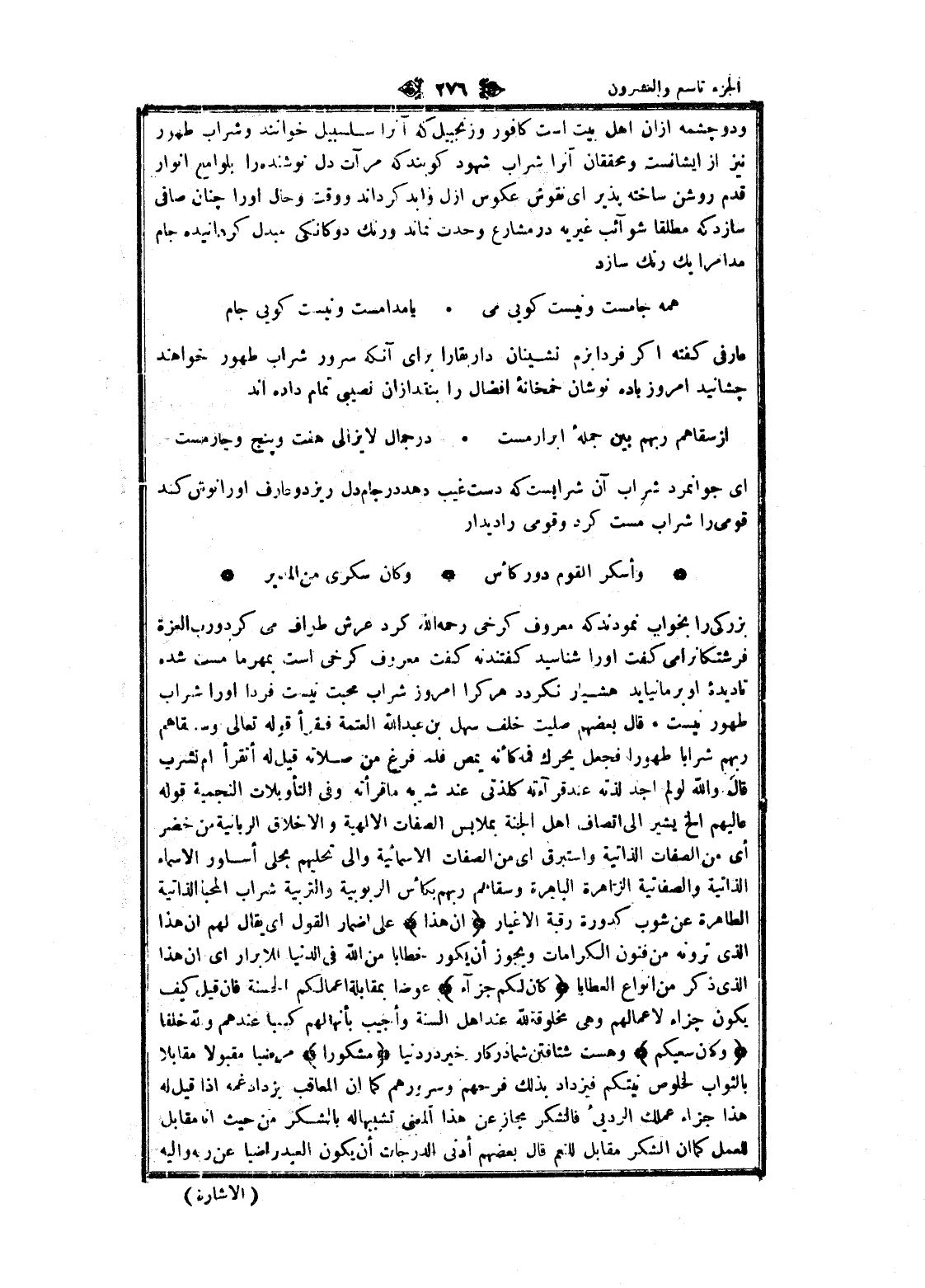 ودو چشمه از ان اهل بيت است كافور وزنجبيل كه آنرا سلسبيل خوانند وشراب طهور نيز از ايشانست ومحققان آنرا شراب شهود كويند كه مرآت دل نوشنده را بلوامع أنوار قدم روشن ساخته پذير اى نقوش عكوس ازل وابد كرداند ووقت وحال او را چنان صافى سازد كه مطلقا شوآئب غيريه در مشارع وحدت نماند ورنك دوگانكى مبدل كردانيده جام مدامرا يك رنك سازد