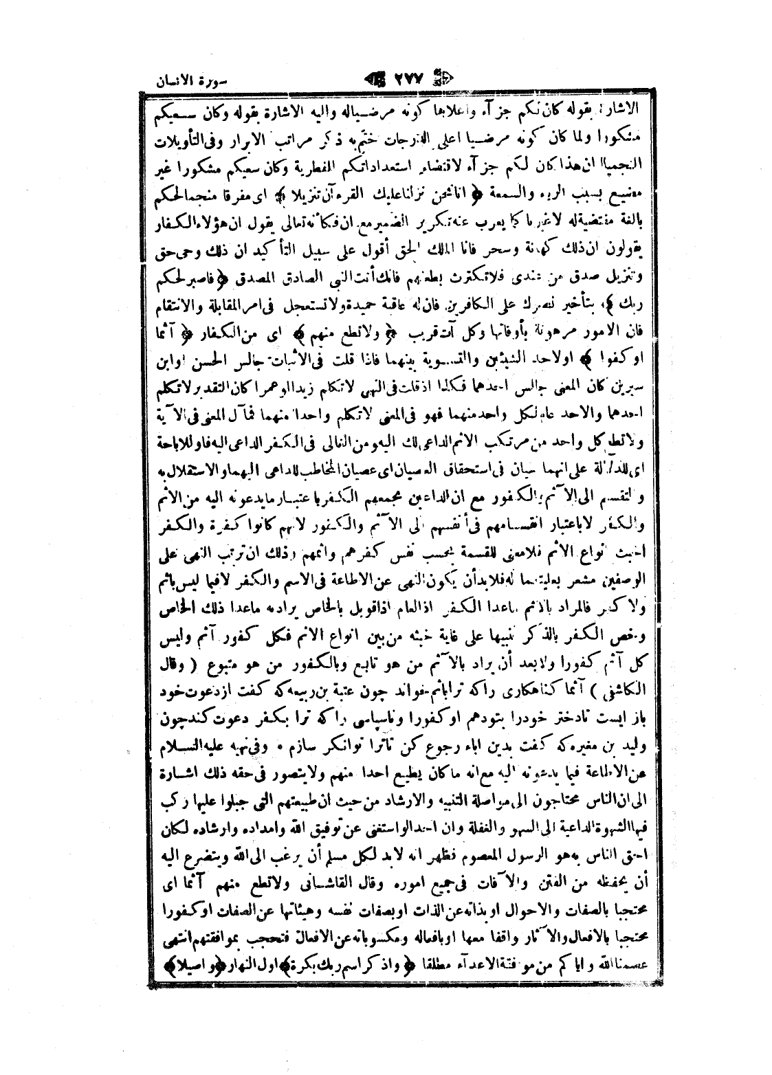 الاشارة بقوله كان لكم جزاء وأعلاها كونه مرضيا له واليه الاشارة بقوله وكان سعيكم مشكورا ولما كان كونه مرضيا أعلى الدرجات ختم به ذكر مراتب الأبرار وفى التأويلات النجمية ان هذا كان لكم جزاء لاقتضاء استعداداتكم الفطرية وكان سعيكم مشكورا غير مضيع بسبب الرياء والسمعة إِنَّا نَحْنُ نَزَّلْنا عَلَيْكَ الْقُرْآنَ تَنْزِيلًا اى مفرقا منجما لحكم بالغة مفتضية له لا غيريا كما يعرب عنه تكرير الضمير مع ان فكأنه تعالى يقول ان هؤلاء الكفار يقولون ان ذلك كهانة وسحر فانا الملك الحق أقول على سبيل التأكيد ان ذلك وحي حق وتنزيل صدق من عندى فلا تكترث بطعنهم فانك أنت النبي الصادق المصدق فَاصْبِرْ لِحُكْمِ رَبِّكَ بتأخير نصرك على الكافرين فان له عاقبة حميدة ولا تستعجل فى امر المقابلة والانتقام فان الأمور مرهونة بأو فانها وكل آت قريب وَلا تُطِعْ مِنْهُمْ اى من الكفار آثِماً أَوْ كَفُوراً او لاحد الشيئين والتسوية بينهما فاذا قلت فى الإثبات جالس الحسن او ابن سيرين كان المعنى جالس أحدهما فكلما إذ قلت فى النهى لا تكلم زيدا او عمرا كان التقدير لا تلكم أحدهما والأحد عام لكل واحد منهما فهو فى المعنى لا تكلم واحدا منهما فمآل المعنى فى الآية ولا تطع كل واحد من مرتكب الإثم الداعي لك اليه ومن الغالي فى الكفر الداعي اليه فاو للاباحة اى للدلالة على انهما سيان فى استحقاق العصيان اى عصيان المخاطب للداعى إليهما والاستقلال به والتقسيم الى الآثم والكفور مع ان الداعين بجمعهم الكفر باعتبار ما يدعونه اليه من الإثم والكفر لا باعتبار انقسامهم فى أنفسهم لى الآثم والكفور لانهم كانوا كفرة والكفر أخبث انواع الإثم فلا معنى للقسمة بحسب نفس كفرهم واثمهم وذلك ان ترتب النهى على الوصفين مشعر بعليتهما له فلا بد أن يكون النهى عن الاطاعة فى الاسم والكفر لا فيما ليس بإثم ولا كفر فالمراد بالإثم ما عدا الكفر إذ العام إذا قوبل بالخاص يراد به ما عدا ذلك الخاص وخص الكفر بالذكر تنبيها على غاية خبثه من بين انواع الإثم فكل كفور آثم وليس كل آثم كفورا ولا بعد أن يراد بالآثم من هو تابع وبالكفور من هو متبوع (وقال الكاشفى) آثما كناهكارى را كه ترا بإثم خواند چون عتبة بن ربيعه كه كفت از دعوت خود باز ايست تا دختر خود را بتو دهم او كفورا ونا سپاسى را كه ترا بكفر دعوت كند چون وليد بن مغيره كه كفت بدين اباء رجوع كن تا ترا توانكر سازم. وفى نهيه عليه السلام عن الاطاعة فيما يدعونه اليه مع انه ما كان يطيع أحدا منهم ولا يتصور فى حقه ذلك اشارة الى ان الناس محتاجون الى مواصلة التنبيه والإرشاد من حيث ان طبيعتهم التي جبلوا عليها ركب فيها الشهوة الداعية الى السهو والغفلة وان أحدا لو استغنى عن توفيق الله وإمداده وإرشاده لكان أحق الناس به هو الرسول المعصوم فظهر انه لا بد لكل مسلم أن يرغب الى الله ويتضرع اليه أن يحفظه من الفتن والآفات فى جميع أموره وقال القاشاني ولا تطع منهم آثما اى محتجبا بالصفات والأحوال او بذاته عن الذات او بصفات نفسه وهيئاتها عن الصفات او كفورا محتجبا بالافعال والآثار واقفا معها او بأفعاله ومكسوباته عن الافعال فتحجب بموافقتهم انتهى عصمنا الله وإياكم من موافقة الأعداء مطلقا وَاذْكُرِ اسْمَ رَبِّكَ بُكْرَةً أول النهار وَأَصِيلًا