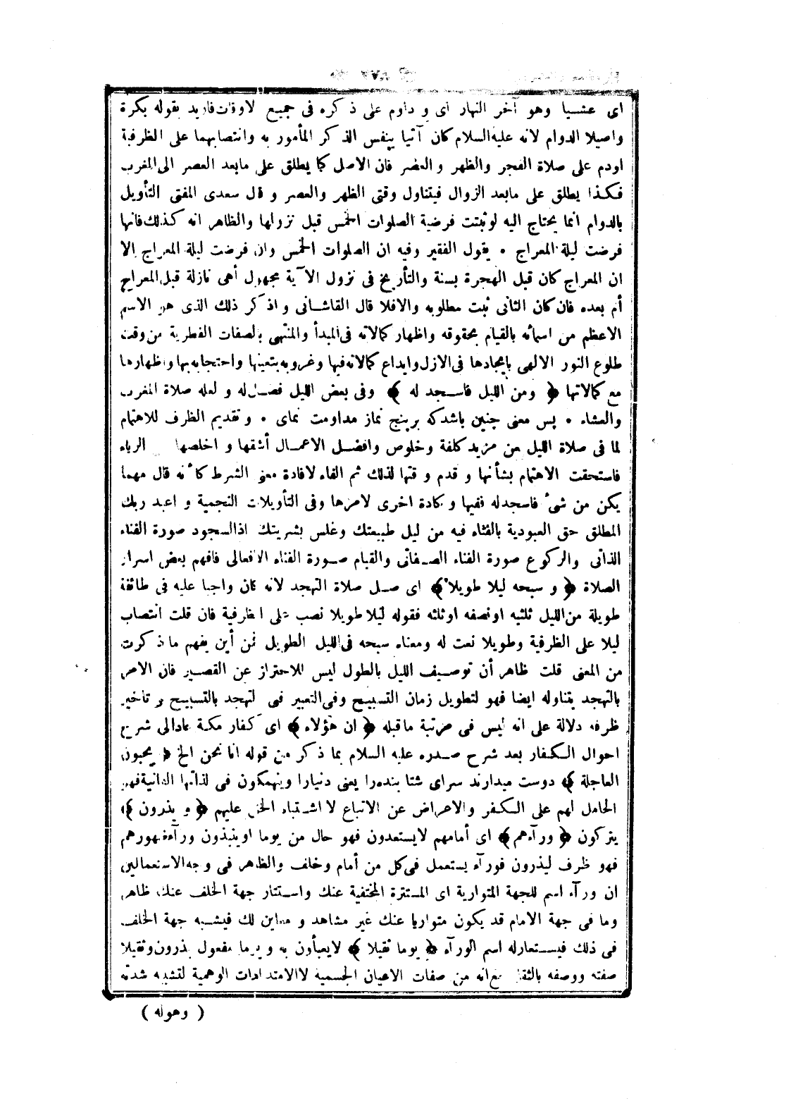 اى عشيا وهو آخر النهار اى وداوم على ذكره فى جميع لاوقات فاريد بقوله بكرة وأصيلا الدوام لانه عليه السلام كان آتيا ينفس الذكر المأمور به وانتصابهما على الظرفية أدوم على صلاة الفجر والظهر والعصر فان الأصل كما يطلق على ما بعد العصر الى المغرب فكذا يطلق على ما بعد الزوال فيتناول وقتى الظهر والعصر وقال سعدى المفتى التأويل بالدوام انما يحتاج اليه لو ثبتت فرضية الصلوات الخمس قبل نزولها والظاهر انه كذلك فانها فرضت ليلة المعراج. يقول الفقير وفيه ان الصلوات الخمس وان فرضت ليلة المعراج الا ان المعراج كان قبل الهجرة بسنة والتأريخ فى نزول الآية مجهول أهي نازلة قبل المعراج أم بعده فان كان الثاني ثبت مطلوبه والا فلا قال القاشاني واذكر ذلك الذي هو الاسم الأعظم من أسمائه بالقيام بحقوقه واظهار كمالاته فى المبدأ والمنتهى بالصفات الفطرية من وقت طلوع النور الإلهي بايجادها فى الأزل وإيداع كمالاته فيها وغروبه بتعينها واحتجابه بها وإظهارها مع كمالاتها وَمِنَ اللَّيْلِ فَاسْجُدْ لَهُ وفى بعض الليل فضل له ولعله صلاة المغرب والعشاء. پس معنى چنين باشد كه بر پنج نماز مداومت نماى. وتقديم الظرف للاهتمام لما فى صلاة الليل من مزيد كلفة وخلوص وأفضل الأعمال أشقها وأخلصها من الرياء فاستحقت الاهتمام بشأنها وقدم وقتها لذلك ثم الفاء لافادة معنى الشرط كأنه قال مهما يكن من شىء فاسجد له ففيها وكادة اخرى لامرها وفى التأويلات النجمية واعبد ربك المطلق حق العبودية بالفناء فيه من ليل طبيعتك وغلس بشريتك إذ السجود صورة الفناء الذاتي والركوع صورة الفناء الصفاتى والقيام صورة الفناء الافعالى فافهم بعض اسرار الصلاة وَسَبِّحْهُ لَيْلًا طَوِيلًا اى صل صلاة التهجد لانه كان واجبا عليه فى طائفة طويلة من الليل ثلثيه او نصفه او ثلثه فقوله ليلا طويلا نصب على الظرفية فان قلت انتصاب ليلا على الظرفية وطويلا نعت له ومعناه سبحه فى الليل الطويل فمن أين يفهم ما ذكرت من المعنى قلت ظاهر أن توصيف الليل بالطول ليس للاحتراز عن القصير فان الأمر بالتهجد يتناوله ايضا فهو لتطويل زمان التسبيح وفى التعبير فى لتهجد بالتسبيح وتأخير ظرفه دلالة على انه ليس فى مرتبة ما قبله إِنَّ هؤُلاءِ اى كفار مكة عاد الى شرح احوال الكفار بعد شرح صدره عليه السلام بما ذكر من قوله انا نحن إلخ يُحِبُّونَ الْعاجِلَةَ دوست ميدارند سراى شتابنده را يعنى دنيا را وينهمكون فى لذاتها العانية فهو الحامل لهم على الكفر والاعراض عن الاتباع لا اشتباه الخن؟؟؟ عليهم وَيَذَرُونَ يتركون وَراءَهُمْ اى أمامهم لا يستعدون فهو حال من يوما او ينبذون ورلء ضهورهم فهو ظرف ليذرون فوراء يستعمل فى كل من أمام وخلف والظاهر فى وجه الاستعمالين ان ورلء اسم للجهة المتوارية اى المستترة المختفية عنك واستتار جهة الخلف عنك ظاهر وما فى جهة الامام قد يكون متواريا عنك غير مشاهد ومعاين لك فيشبه جهة الخلف فى ذلك فيستعار له اسم الوراء يَوْماً ثَقِيلًا لا يعبأون به ويرما مفعول يذرون وثقيلا صفته ووصفه بالثقل مع انه من صفات الأعيان الجسمية لا الامتدادات الوهمية لتشبيه شدته